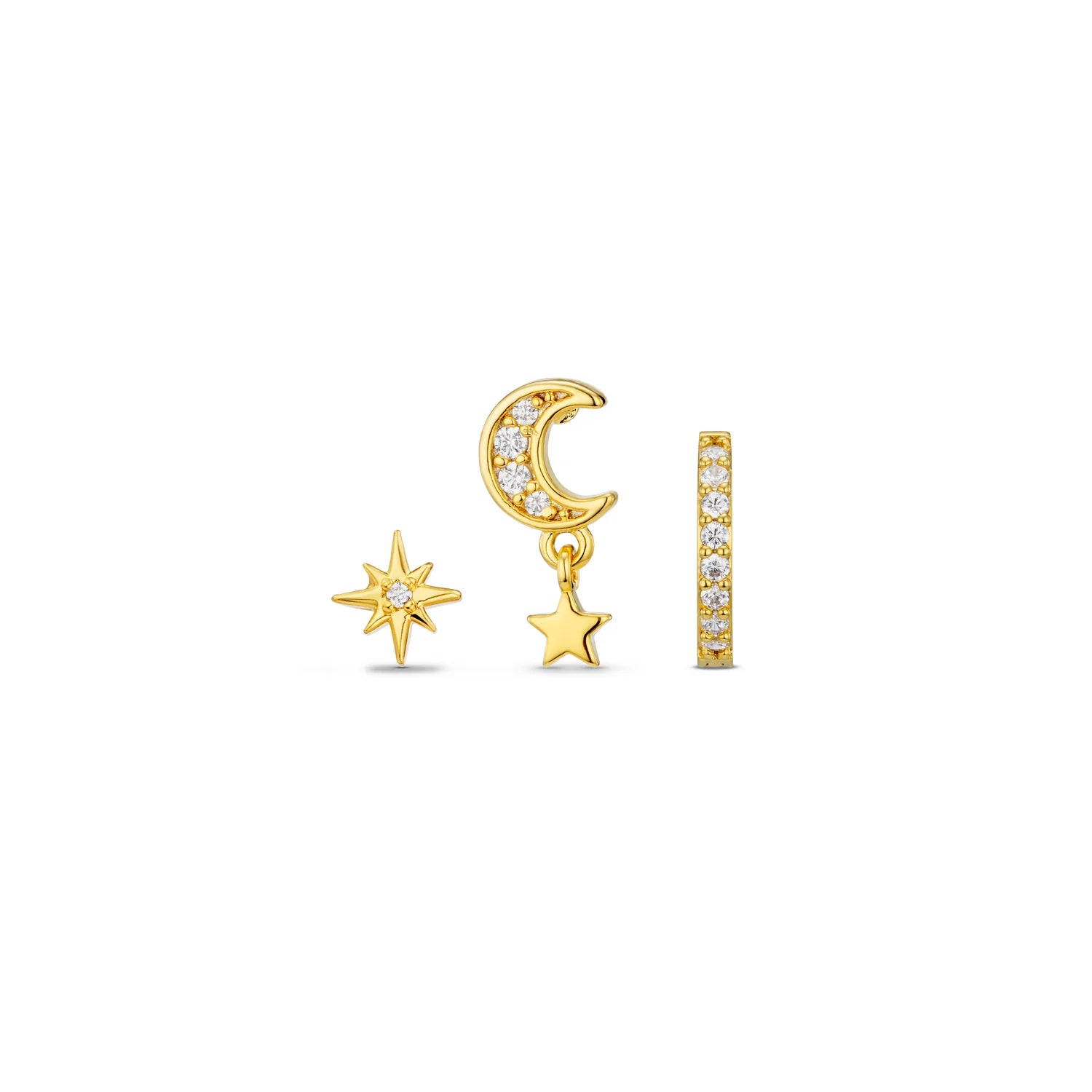 Featuring a starburst stud earring, a moon shaped stud with a star drop charm & a simple pave encrusted huggie hoop earring.