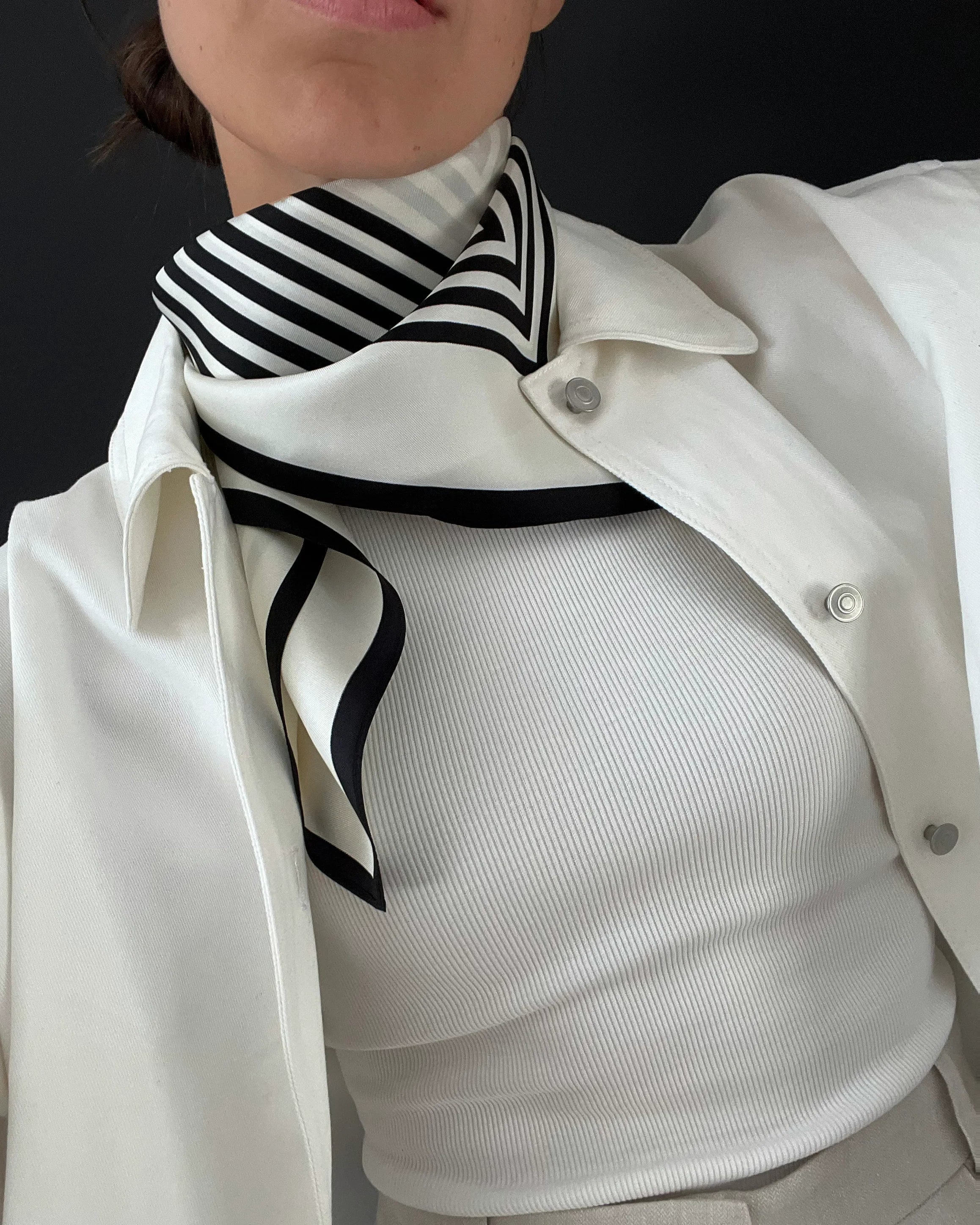 The first and most classic design by Le Scarf, launched in 2018. This scarf comes in a medium size of 65x65 cm, designed to be worn in a variety of ways. Wrap it once or twice around your neck, wear it around your waist or loop it through a high ponytail.