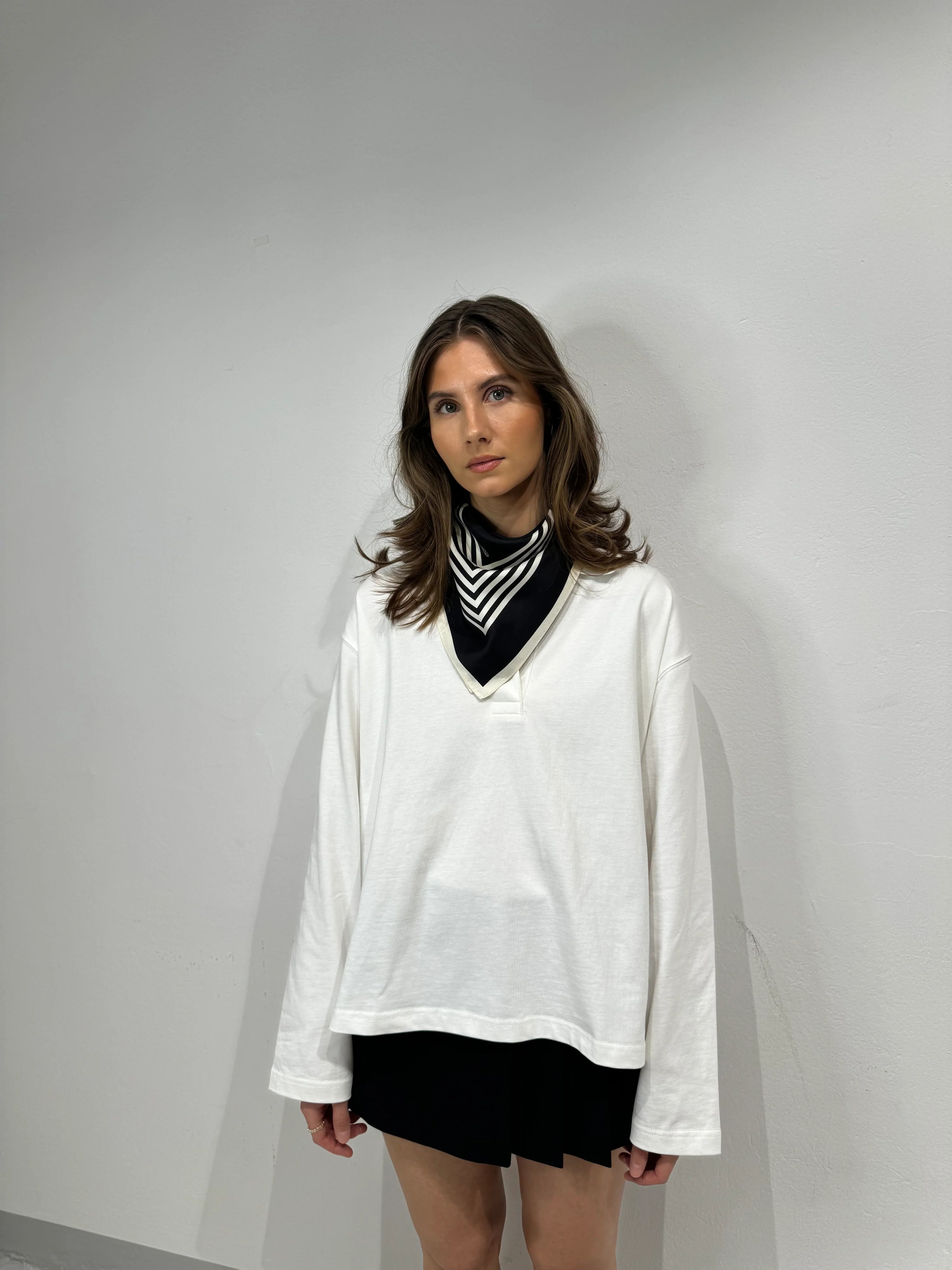 This scarf comes in a medium size of 65x65 cm, designed to be worn in a variety of ways. Wrap it once or twice around your neck, wear it around your waist or loop it through a high ponytail.