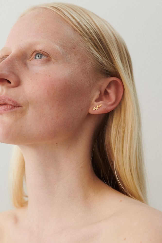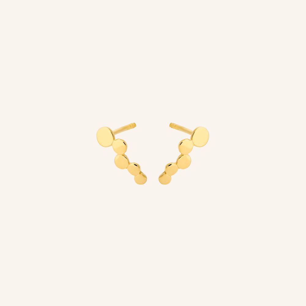 Delicate gold ear climber-styled earrings featuring a modern, flowy design that follows the curve of the ear. These elegant and lightweight earrings add a touch of sophistication and uniqueness perfect for everyday wear or elevating a minimalist look.