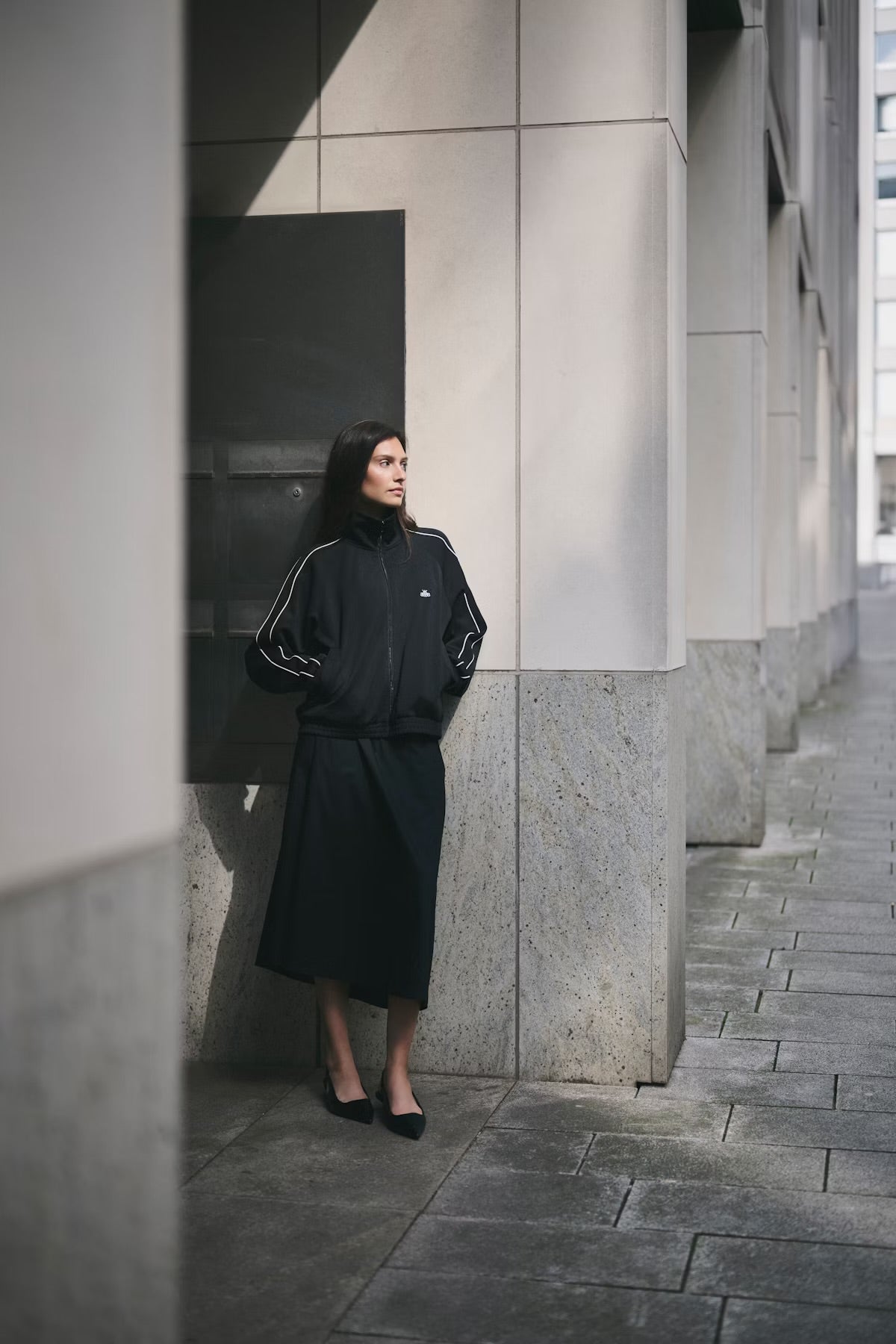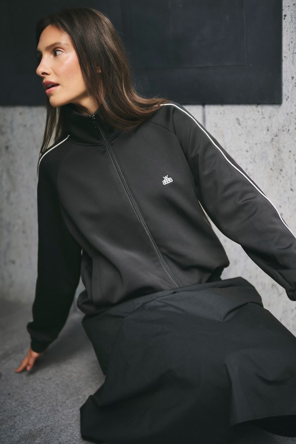 Sporty and sleek, this lightweight black track-style jacket features a full zip-down front and bold white stripe detailing along the sleeves and chest. Designed for comfort and movement, it’s made from breathable fabric, perfect for layering on active days or adding an athletic edge to your casual look. Finished with a stand collar and a streamlined fit.