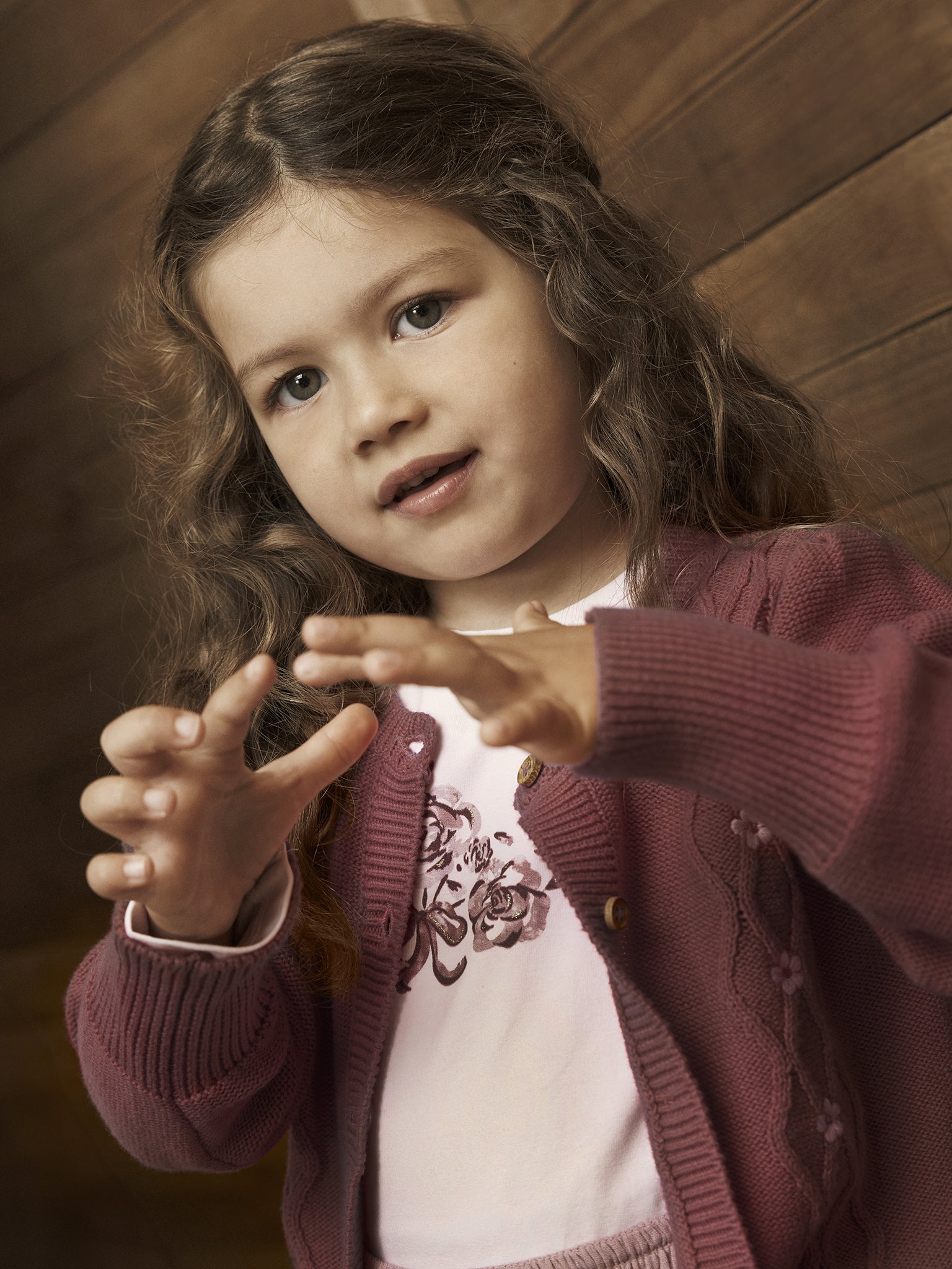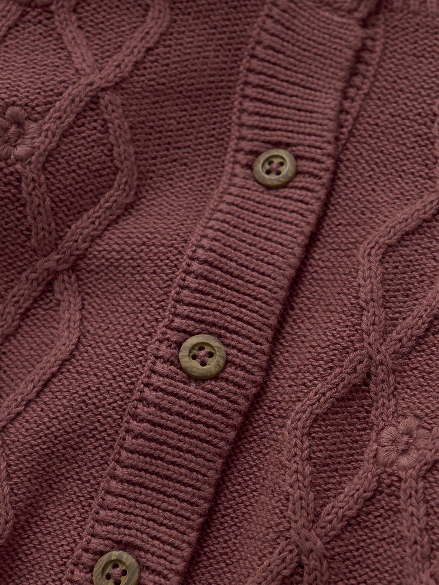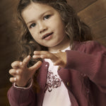 Beautiful knitted cardigan from EN FANT with a round neckline and long sleeves. The cardigan features a delicate cable knit pattern and small floral details that add an elegant touch. The sleeves have a slight puff effect, giving it a classic look. Ribbed edges at the sleeves, neckline, and hem ensure a good fit and comfort.