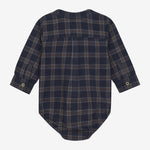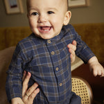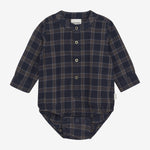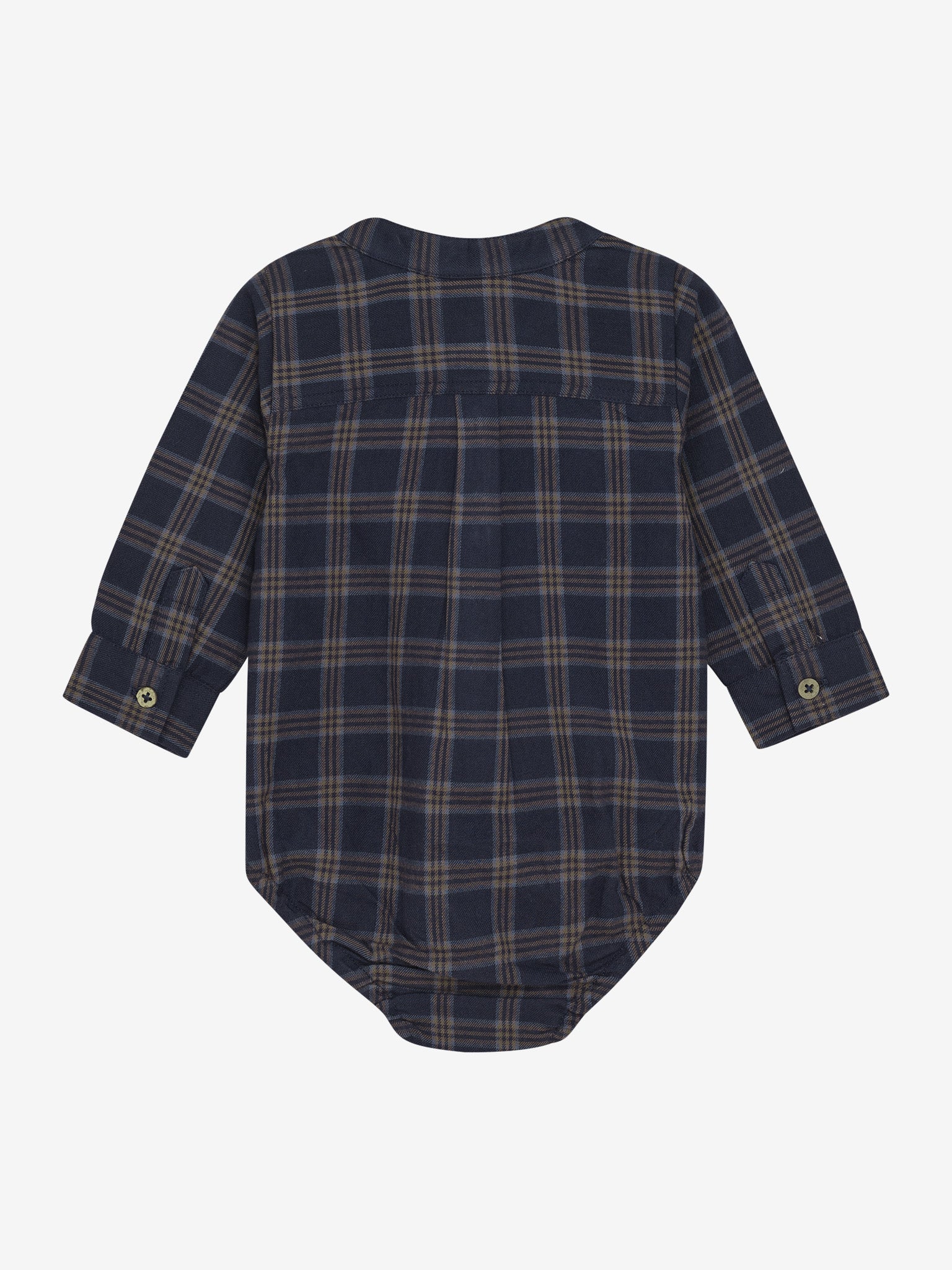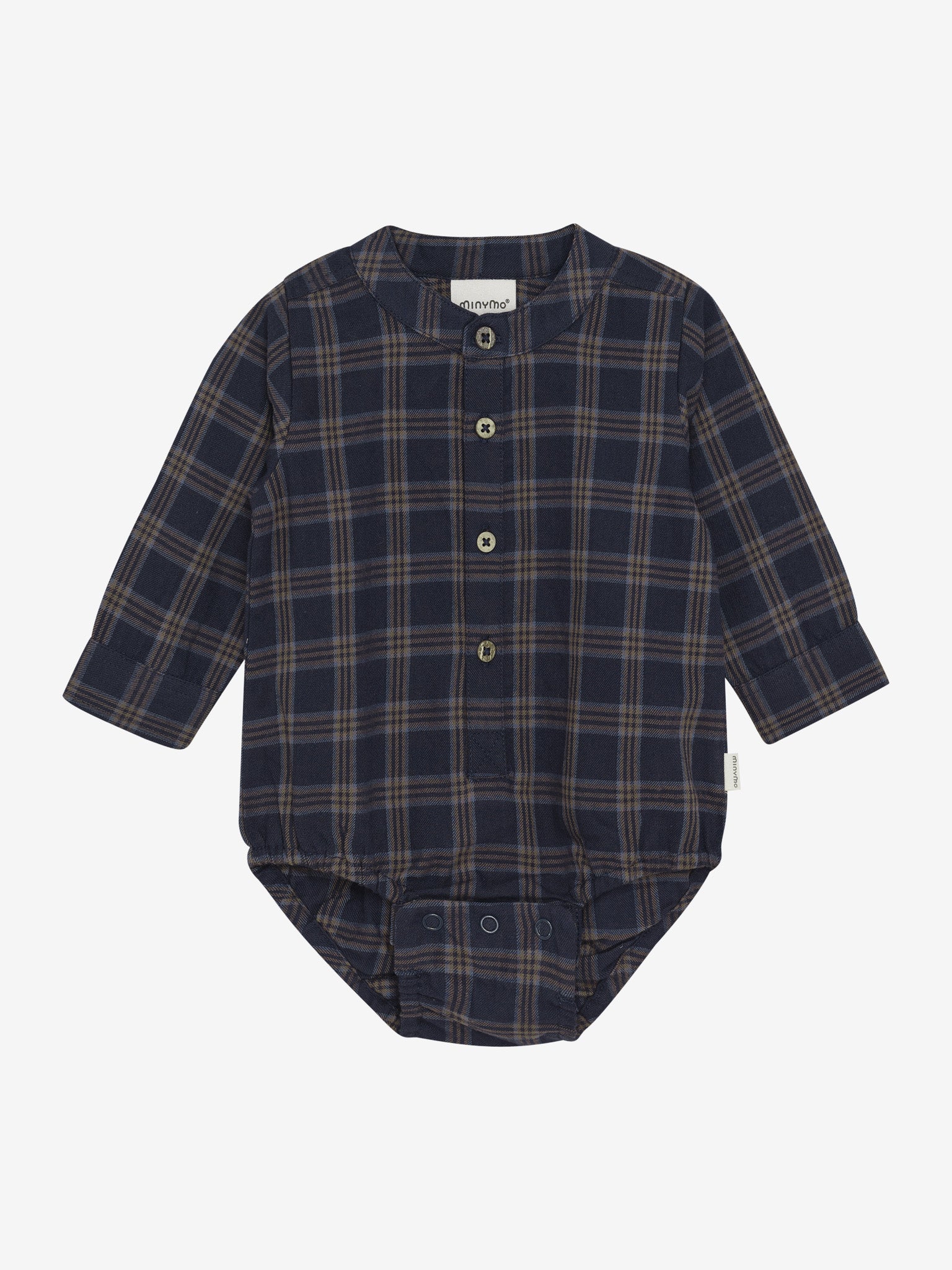 Stylish long-sleeved bodysuit from Minymo. The bodysuit features a nice checked all-over design. It also has buttons down the front, giving it a shirt-like appearance. The bodysuit has snap buttons between the legs, making it easy to fasten. It is made from 100% organic cotton, which feels comfortable against the skin