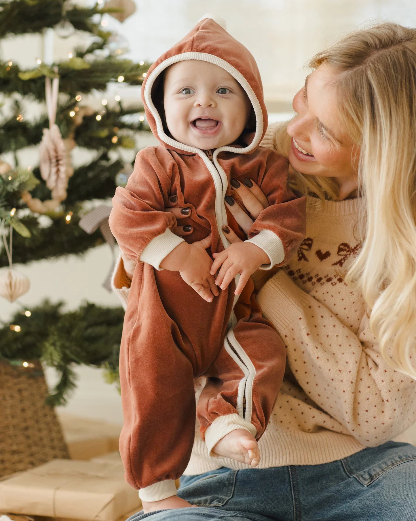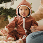 Long sleeve hooded fleece jumpsuit with ribbed sleeve and leg openings, a zipper down the front, and a hoodie with a pom pom on top.