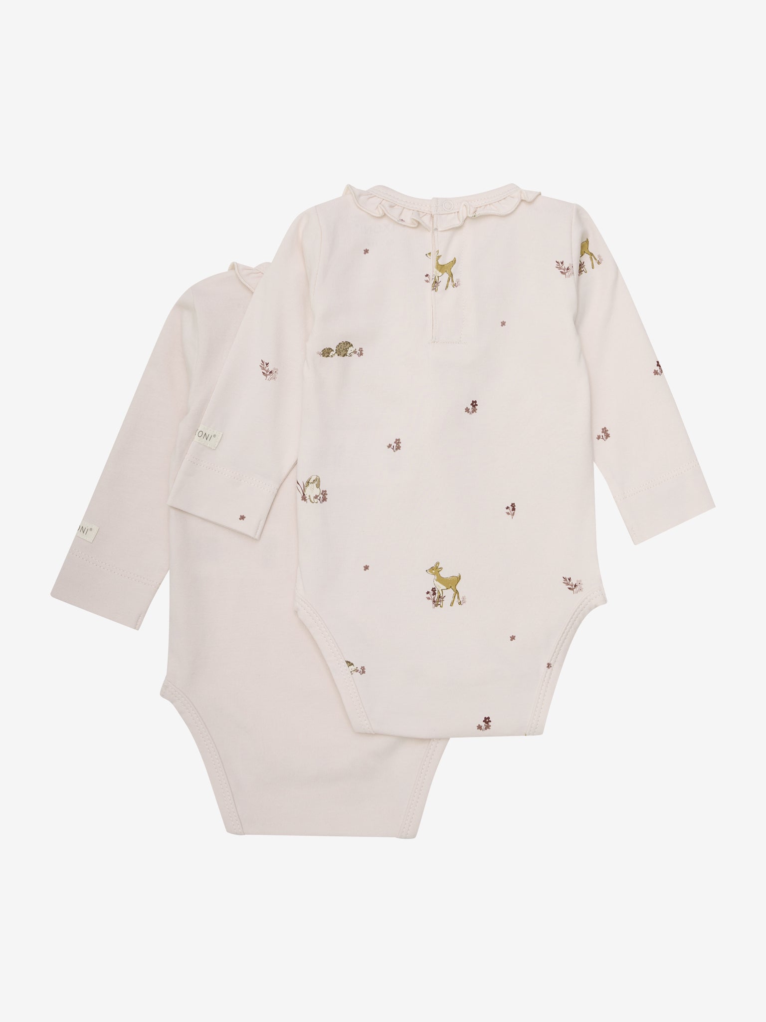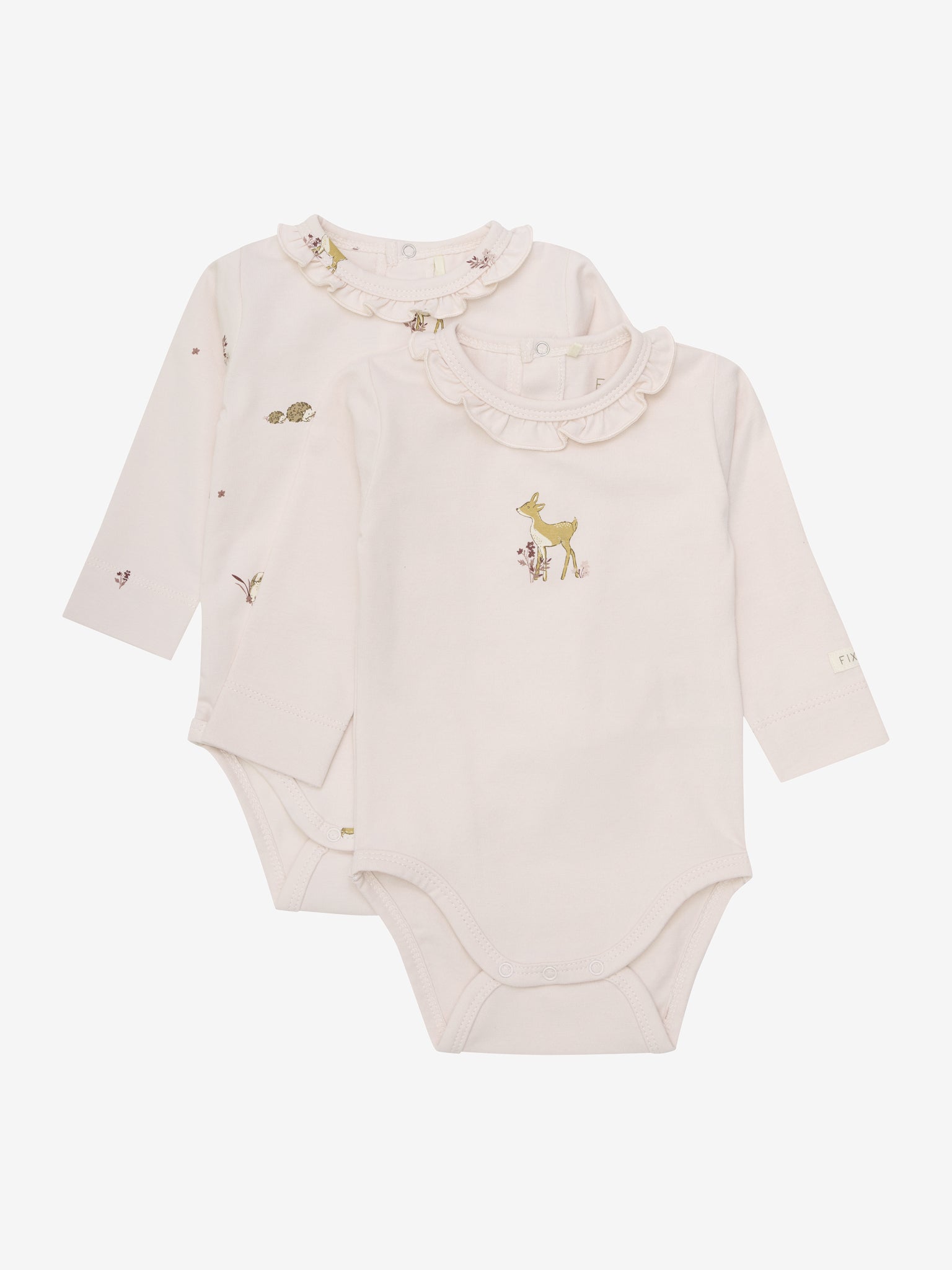 Long-sleeved wrap-around body from FIXONI. Sold as a 2-pack with an all-over printed body and a solid-colored with a print in the front on the chest. The body opens with practical snaps in the front and between the legs, so it can be put on and off easily.