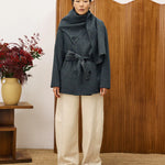 This short checked coat combines classic tailoring with contemporary details. Crafted from exclusive FRNCH fabric, it features a straight, short cut, wide sleeves, and a hanging scarf for a chic layered look. Finished with black button closures, two practical pockets, and warm fabric, it’s the perfect blend of style and comfort.