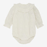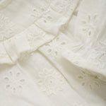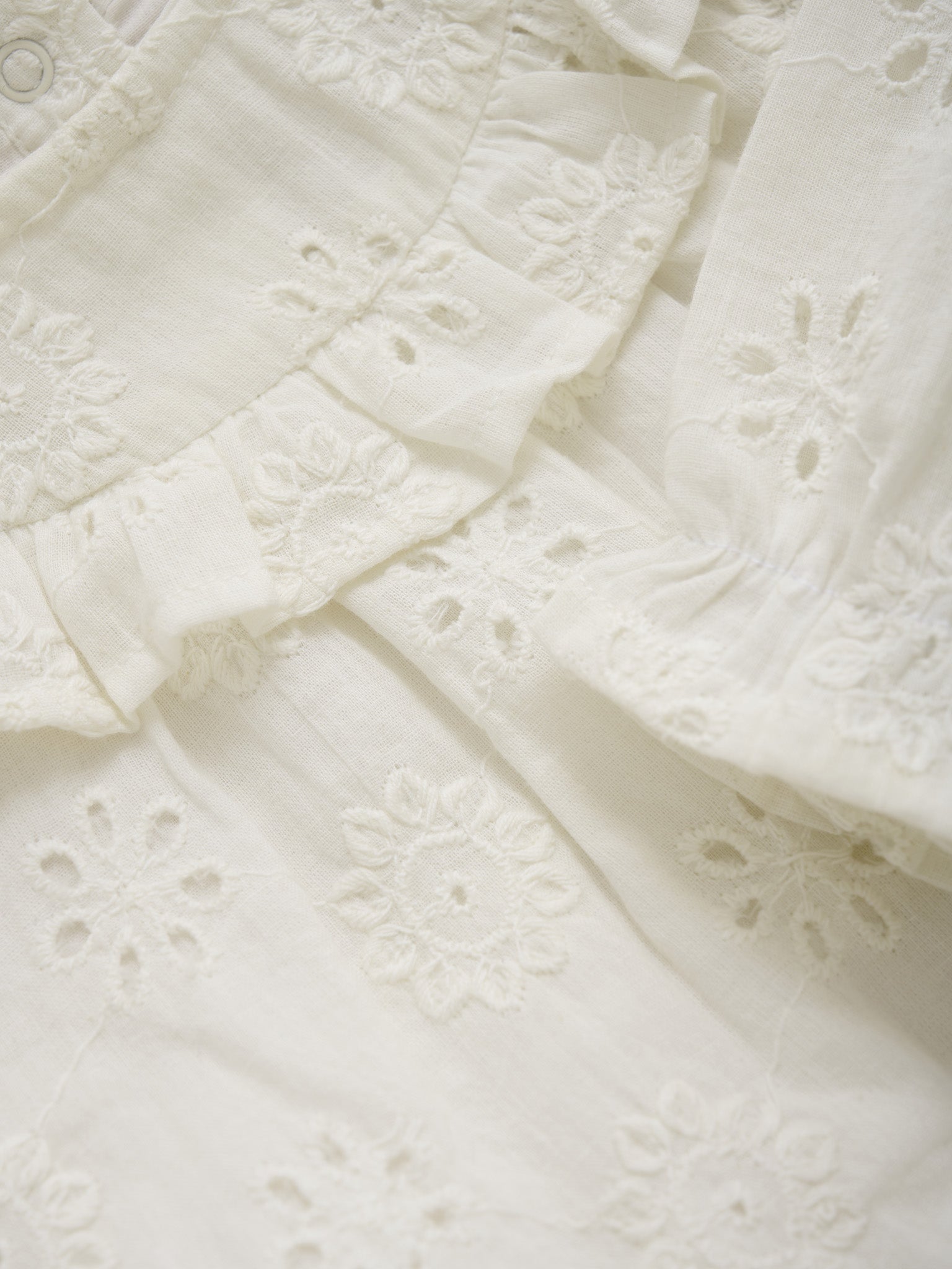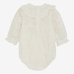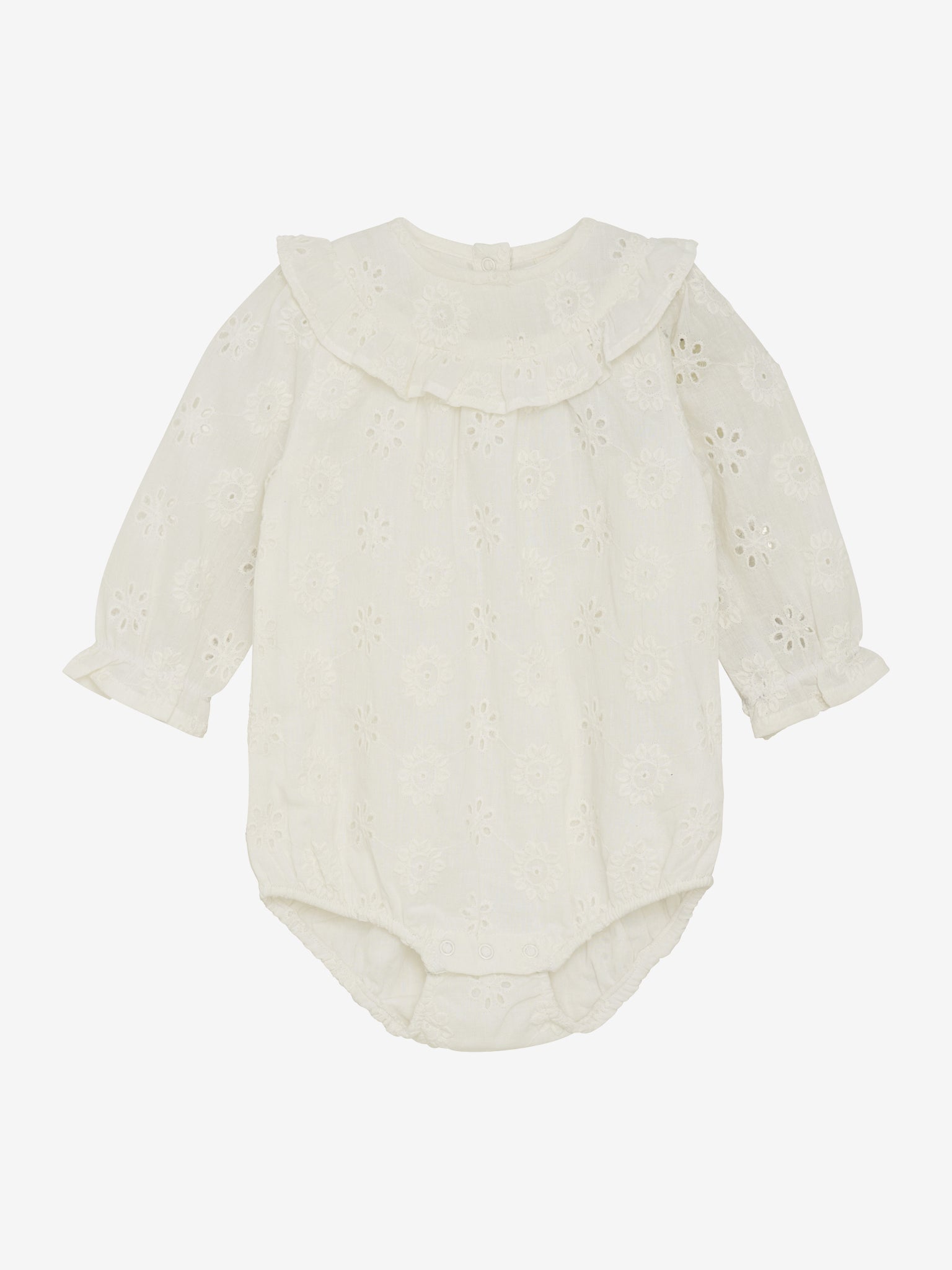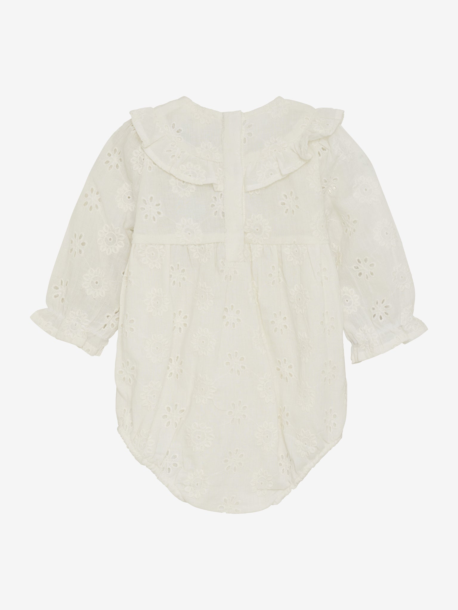 Beautiful romper from EN FANT, crafted in a lovely cotton quality. The romper features many delicate details, such as a ruffled collar and fabric gathers at the sleeves, creating a charming girly look. Elastic at the leg openings ensures a comfortable fit. Closes with press studs at the neck and between the legs.