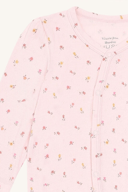 Long sleeved sleepsuit in soft, stretchy viscose from bamboo with an adorable floral print. With its snap button closure it is the practical option for your little one. Perfect option for this Spring.