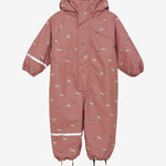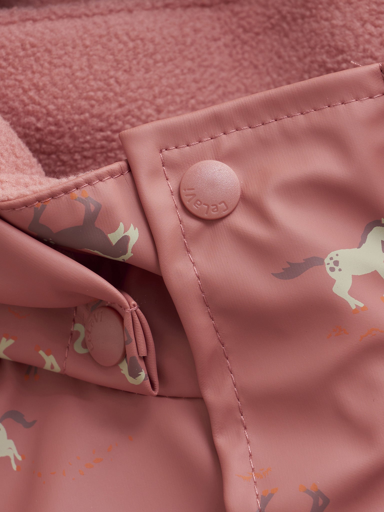 Rainsuit made of recycled polyester with PU coating with all-over print and fleece lining in durable material from CeLaVi. Tested water column pressure of 10,000 mm. The suit opens at the front with a quality zipper with chin protector and double windpole, on which the outer closes with practical snaps. The chin protector makes sure that the zipper feels soft under the chin. The suit has soft fleece lining and a detachable hood. Adjustable elastic foot straps that can be put under the boots so that it stays in place. Reflective details in several places on the suit. It has a name tag inside. Certified acc. to GRS - Made with 51% Recycled Material CERES-0366