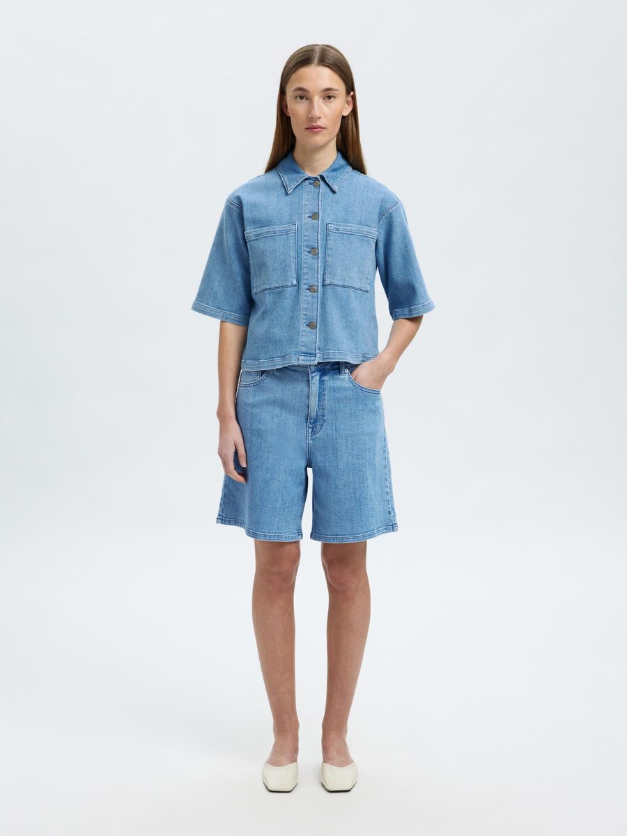 Elevate your casual wardrobe with this effortlessly stylish cropped denim shirt. Designed for comfort and versatility, it features a classic button-up front, regular collar and relaxed dropped shoulders. The half-length and chest patch pockets add a laid-back charm, while the cropped fit pairs perfectly with high-waisted bottoms.