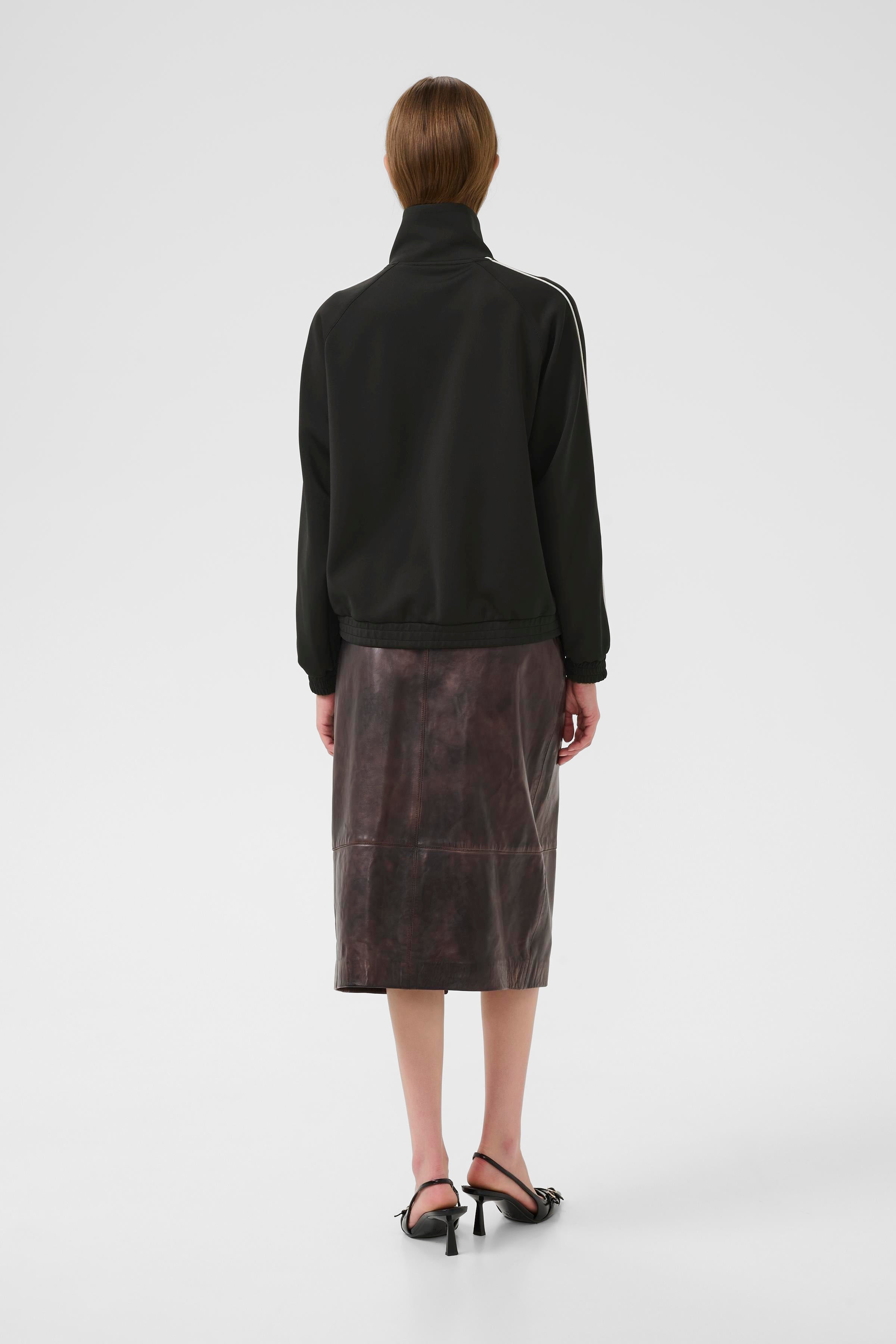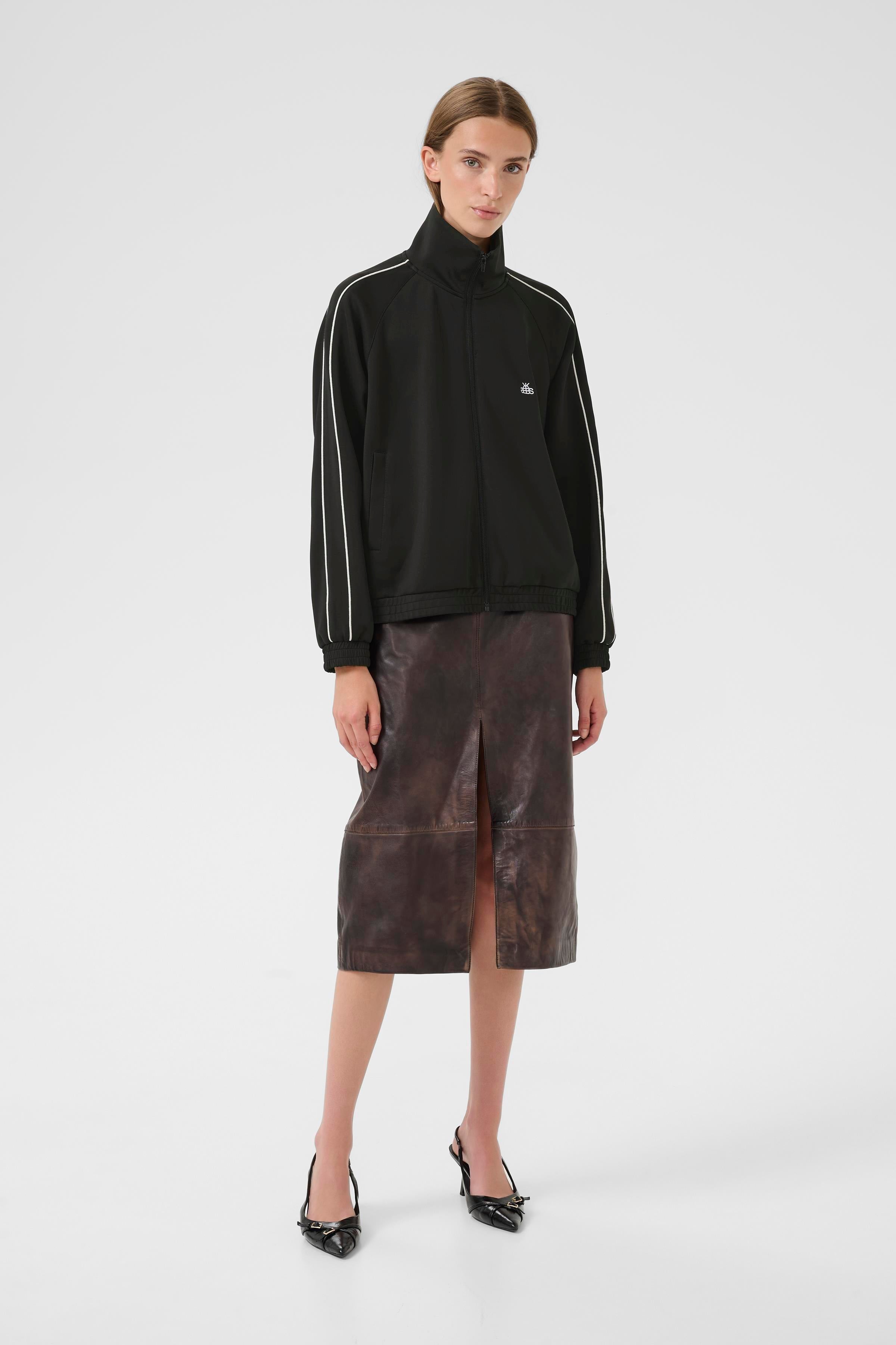 Sporty and sleek, this lightweight black track-style jacket features a full zip-down front and bold white stripe detailing along the sleeves and chest. Designed for comfort and movement, it’s made from breathable fabric, perfect for layering on active days or adding an athletic edge to your casual look. Finished with a stand collar and a streamlined fit.