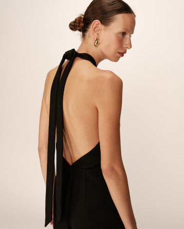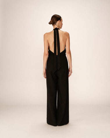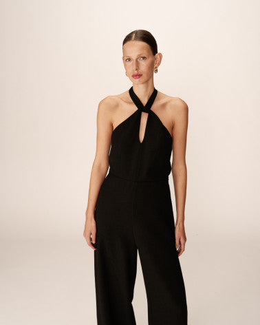 Elegant and Timeless the Philomene black jumpsuit exudes sophistication with its sleek, minimalist design. Featuring a halter-neck with a self-tie strap, it gracefully reveals the back while the crossover neckline adds a refined touch. The regular fit and flared trousers create a flattering silhouette, finished with a discreet back zip closure for effortless wear. A modern statement piece for any occasion.