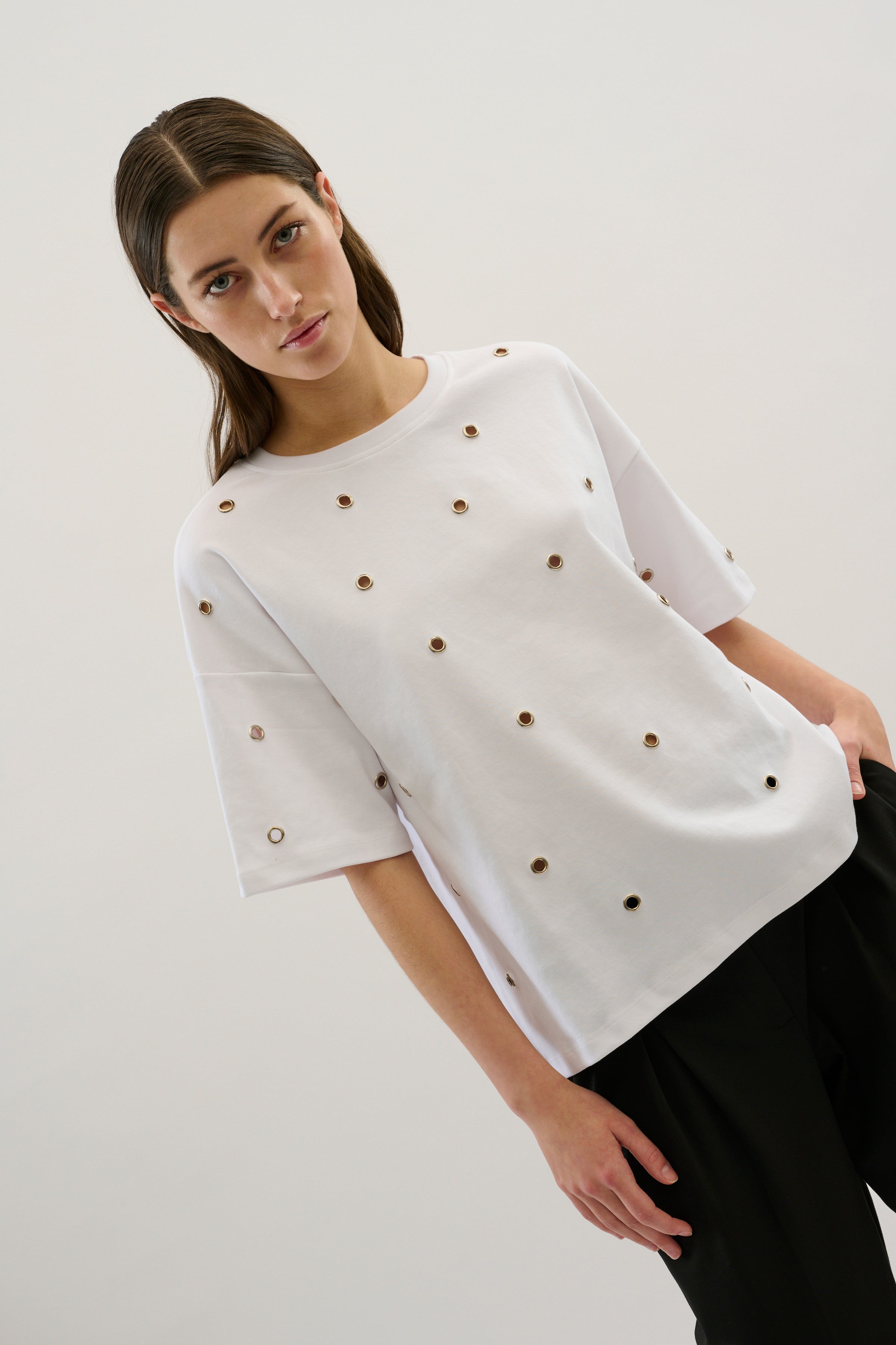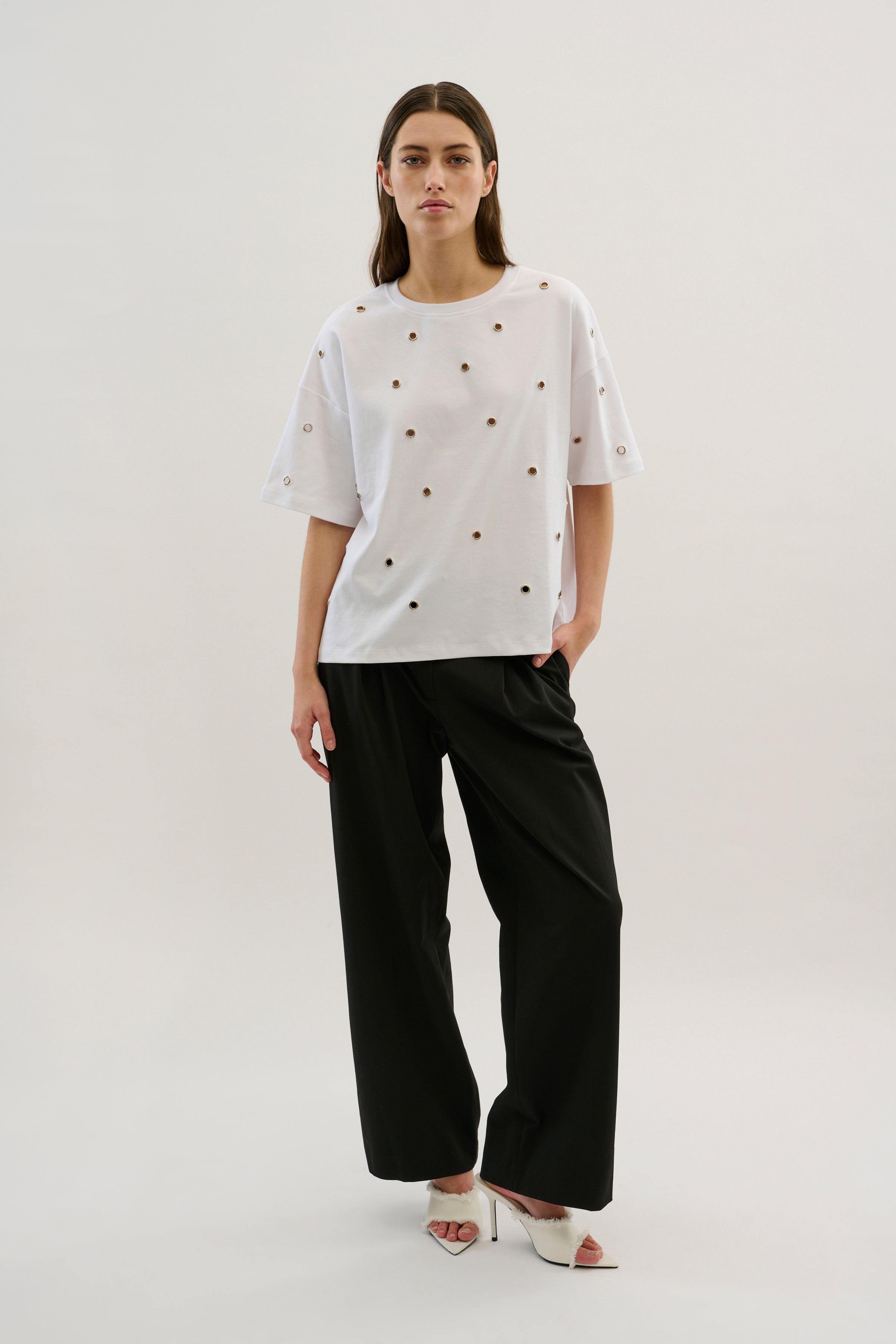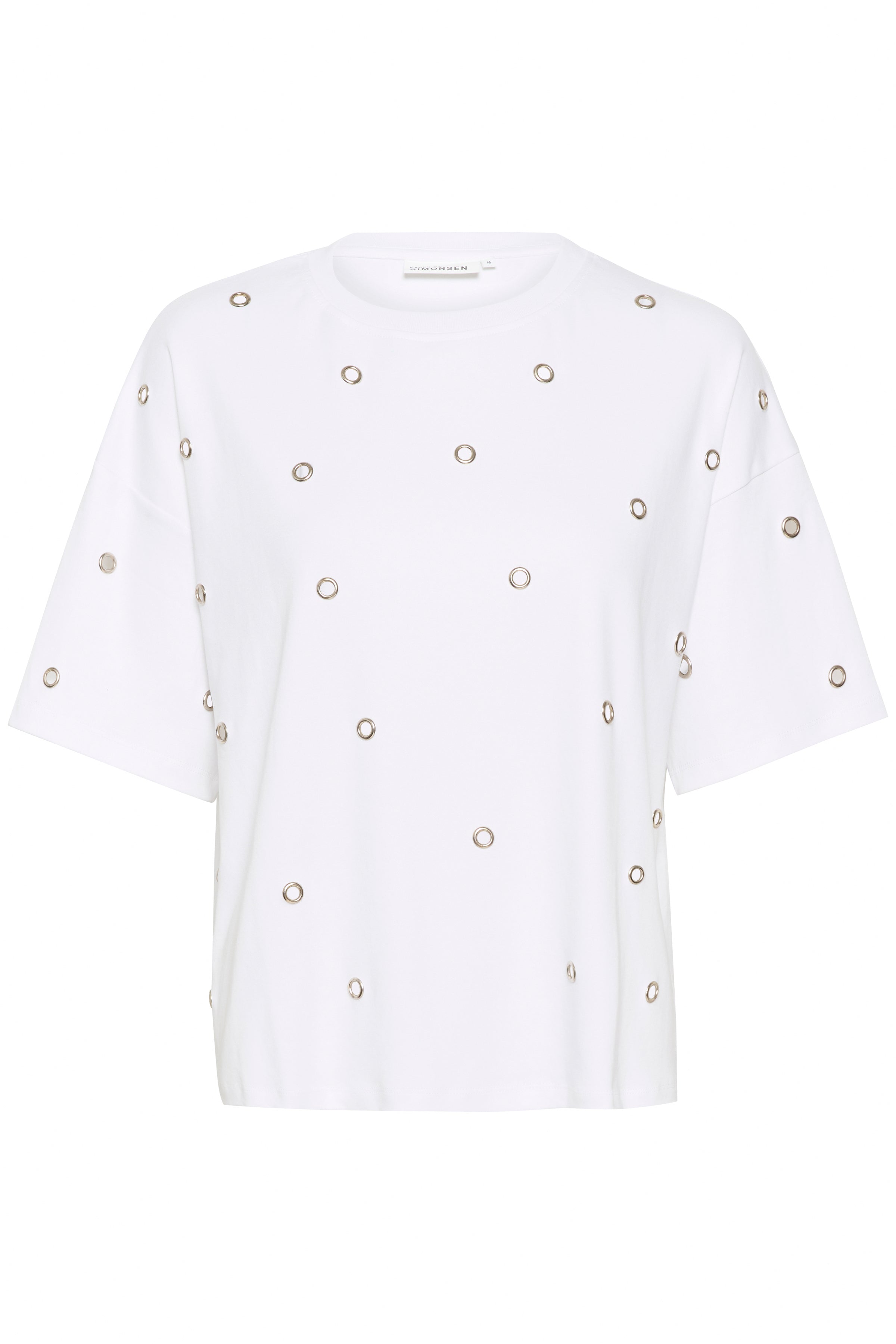 This white t-shirt offers a modern twist on a classic piece. Featuring sheer circle cut-out accents with silver detailing, adding a subtle yet eye catching effect. With a crew neckline, short sleeves, and a relaxed fit, this t-shirt seamlessly blend elegance and everyday wearability.
