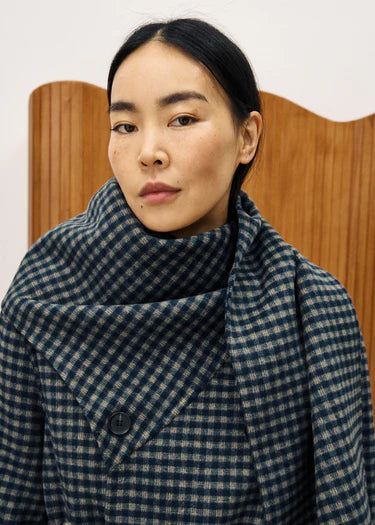 This short checked coat combines classic tailoring with contemporary details. Crafted from exclusive FRNCH fabric, it features a straight, short cut, wide sleeves, and a hanging scarf for a chic layered look. Finished with black button closures, two practical pockets, and warm fabric, it’s the perfect blend of style and comfort.