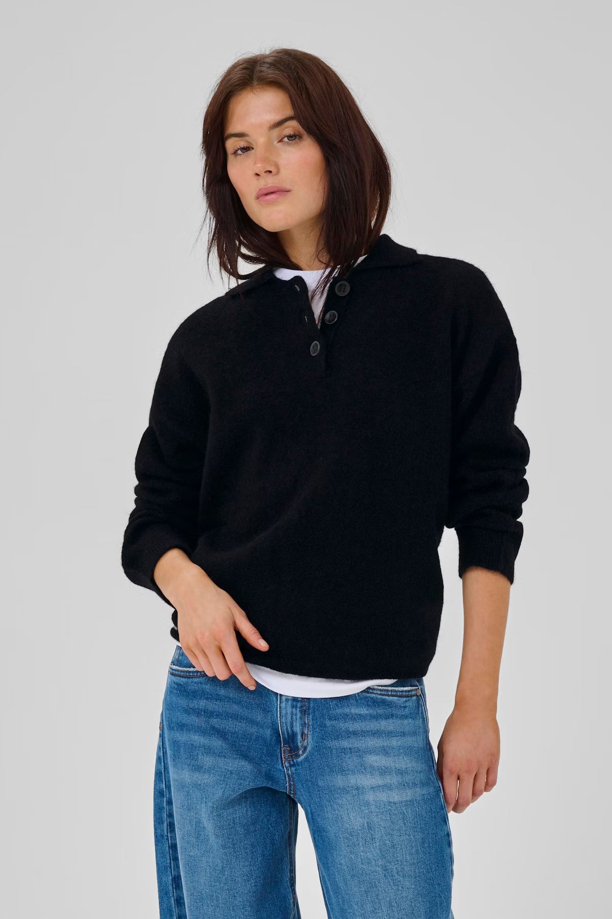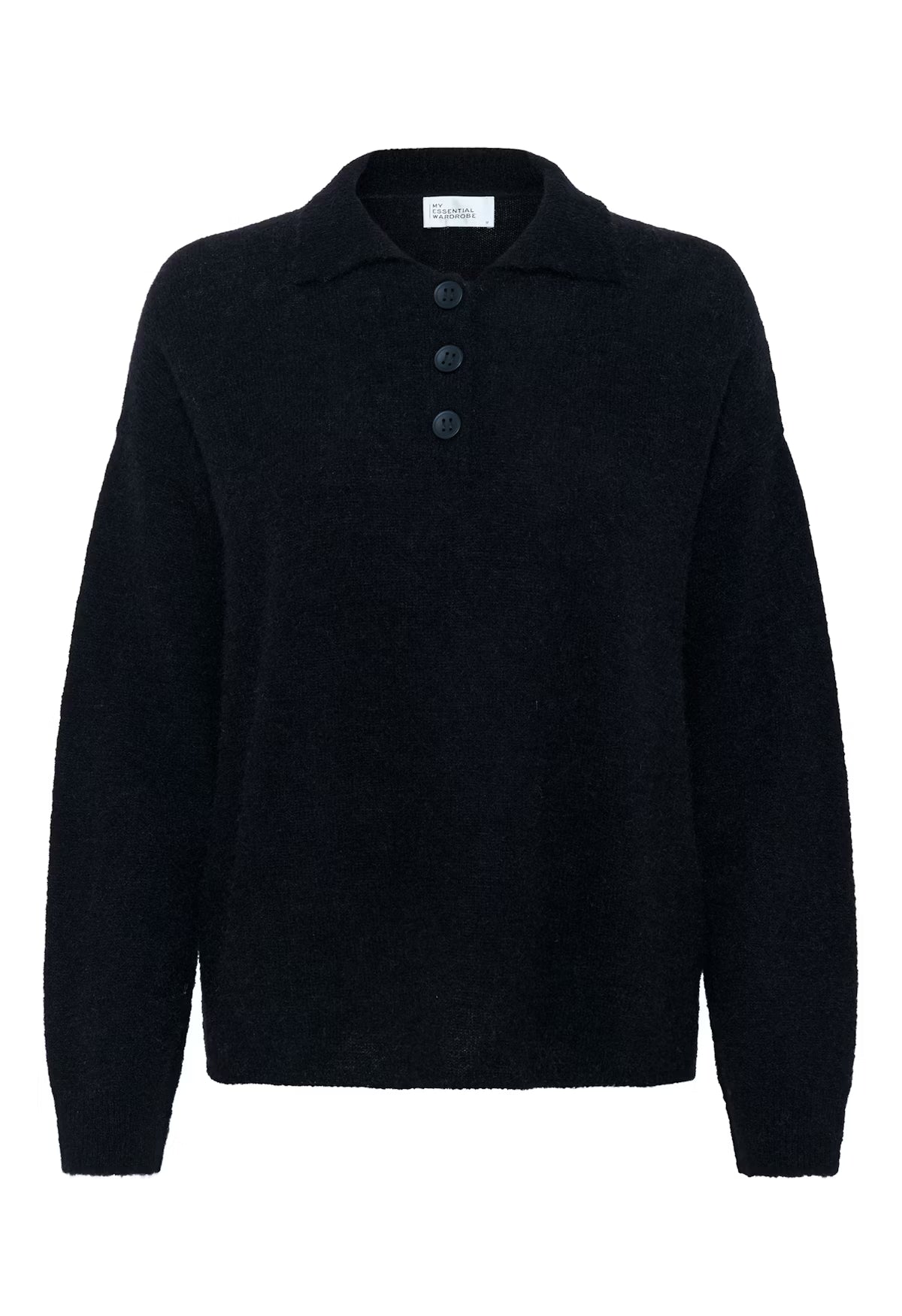 This women's pullover sweater features a relaxed fit, a classic polo collar and button placket, plus full-length sleeves for versatile comfort and everyday style. Suitable for layering and various occasions. Featuring 34% Polyamide, 30% Mohair, 30% Wool, and 6% Elastane.