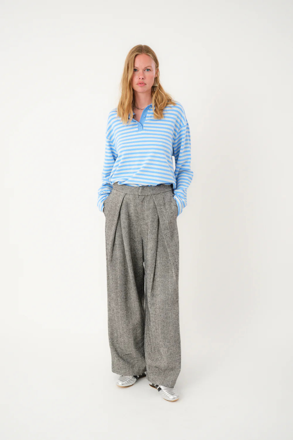 The Zola pants blend elegance and ease with their wide‑leg design, soft front pleats, and relaxed fit. A fixed waistband keeps them polished and flattering, while the exclusive herringbone pattern adds subtle texture and sophistication. Pair with a fitted knit for everyday chic.