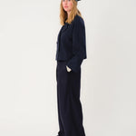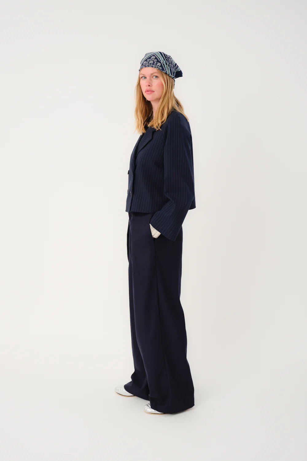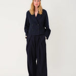 The Zola pants blend elegance and ease with their wide‑leg design, soft front pleats, and relaxed fit. A fixed waistband keeps them polished and flattering, while the exclusive herringbone pattern adds subtle texture and sophistication. Pair with a fitted knit for everyday chic.