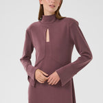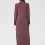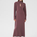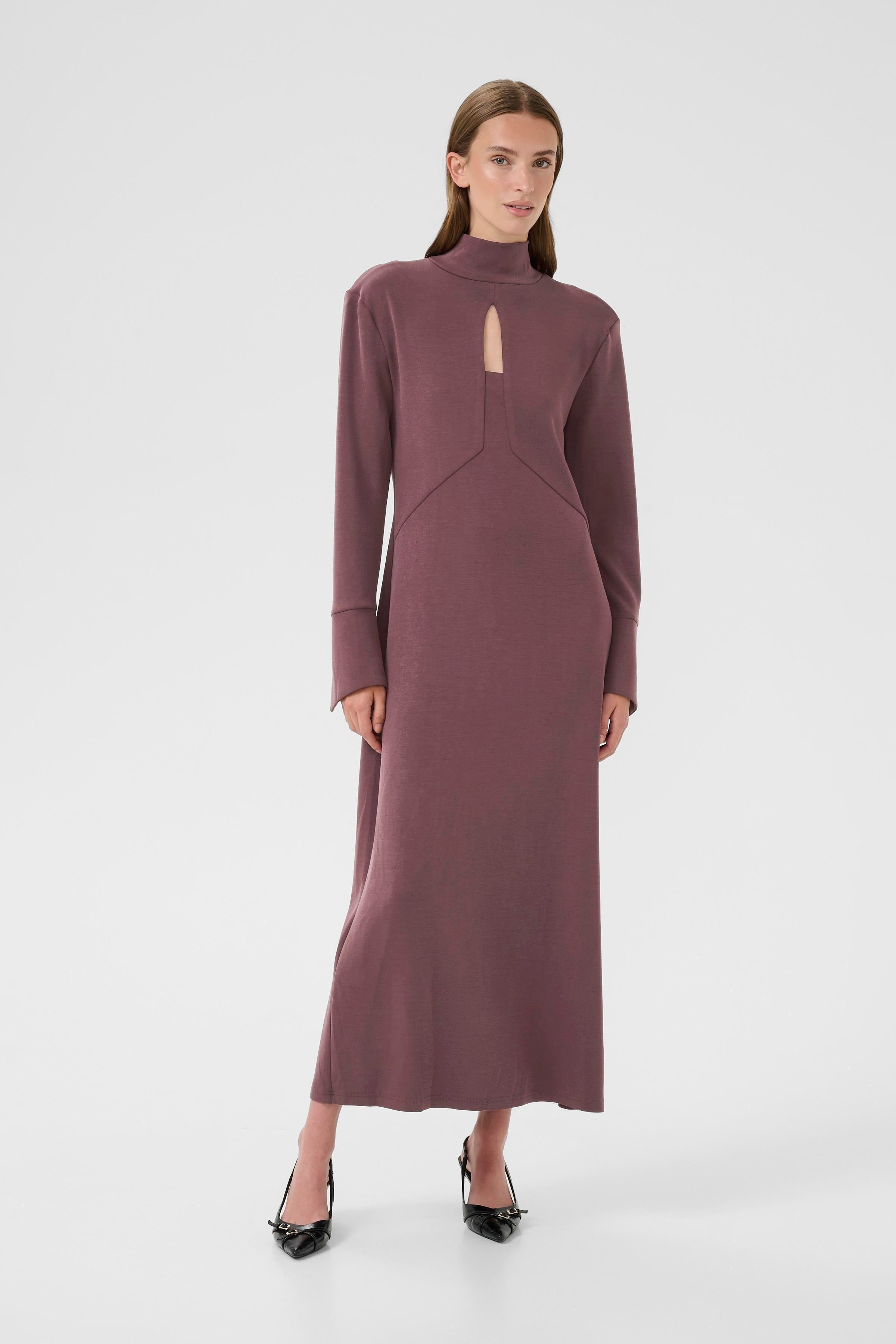 This long, huckleberry-colored dress blends comfort and elegance with its soft jersey fabric and flattering midi length. Designed with long sleeves and a subtle chest cut-out, it adds a hint of allure while maintaining a refined silhouette. Effortless to wear and easy to style, it’s the perfect piece for day-to-night dressing.