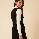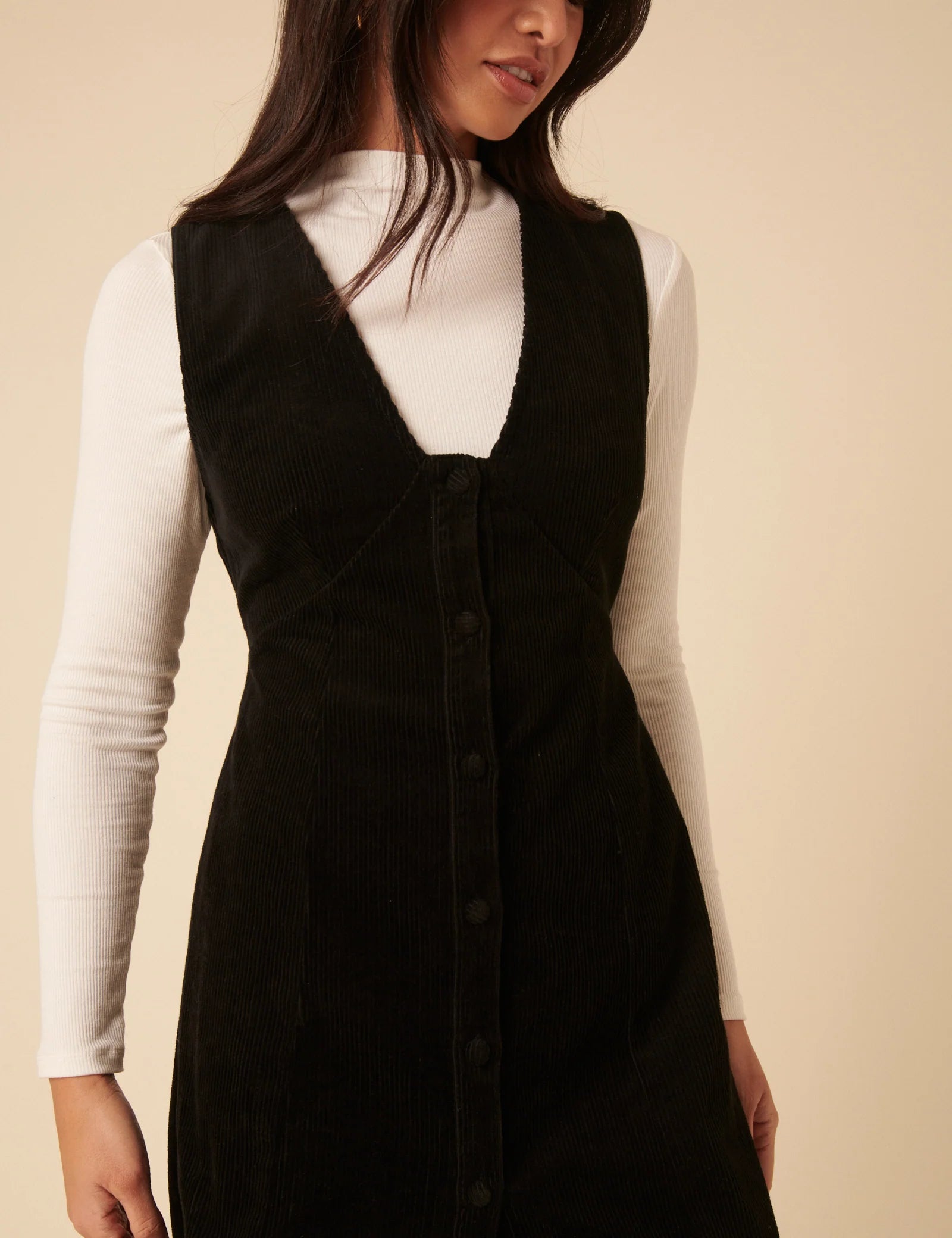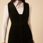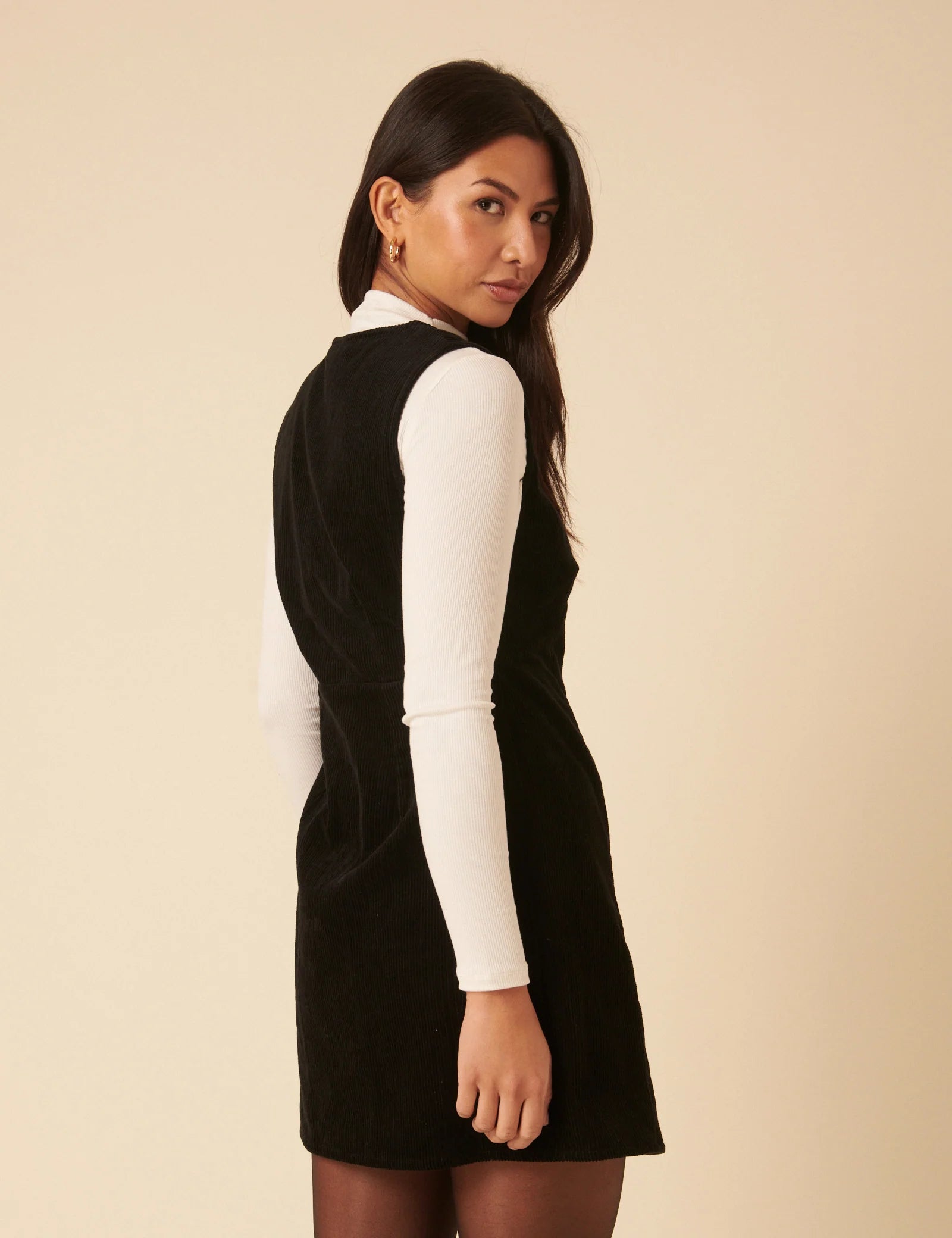 Add a touch of retro charm with this black corduroy pinafore dress, featuring a flattering V-neckline and sleeveless design. The button-through front placket adds a classic detail, while the above-the-knee length keeps the look playful and versatile. Perfect for layering over tees, blouses, or turtlenecks for an effortless everyday outfit.
