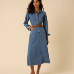 Effortlessly cool and timeless, this blue denim midi dress is a versatile wardrobe staple. Designed with a structured collar, long sleeves, and a full button-front closure, it offers classic style with a modern edge. The dress features a traditional five-pocket design and hits just above the ankles for a flattering, elongated silhouette. Perfect for layering or wearing solo across seasons.