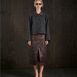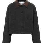 A stylish tweed-inspired wool jacket featuring a rich brown leather collar for a refined contrast. Designed with two front pockets, one on each side, this button-down piece combines classic tailoring with casual ease. The shorter, hip-length cut makes it versatile for layering, while the textured fabric adds a timeless touch