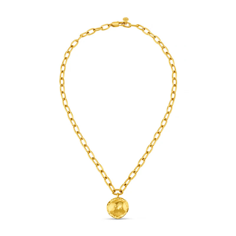 A statement in modern minimalism, featuring oval links and a molten-textured coin pendant. Ideal for layering with simple chains and let this pendant catch the light and everyone's eye.