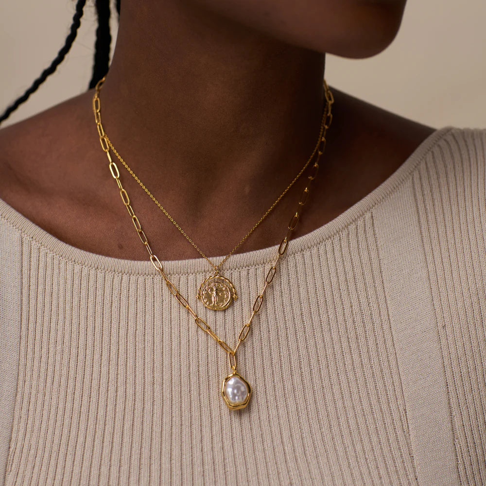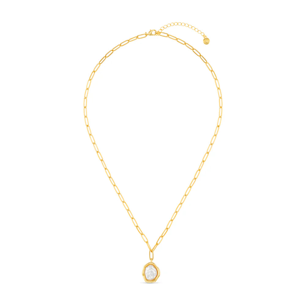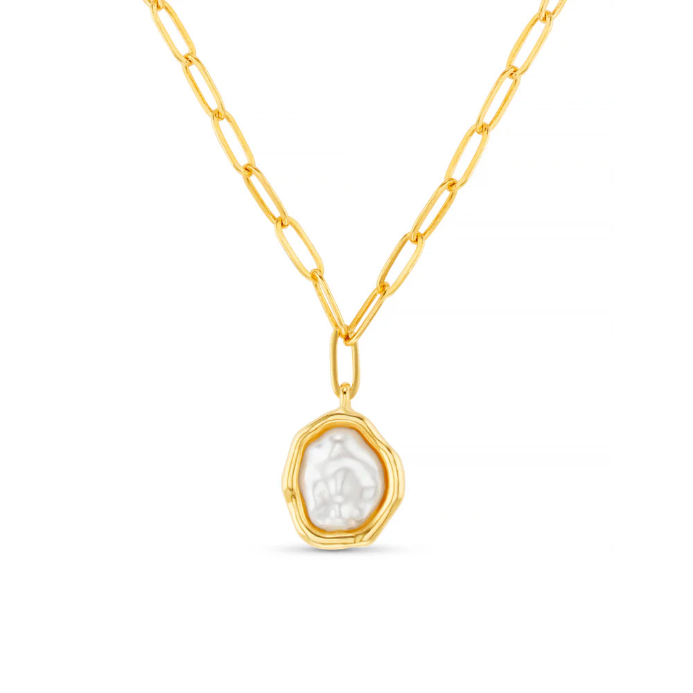 The Organic Molten Pearl Pendant Necklace showcases a stunning, asymmetrical faux pearl pendant with a molten, textured design set on a chain.