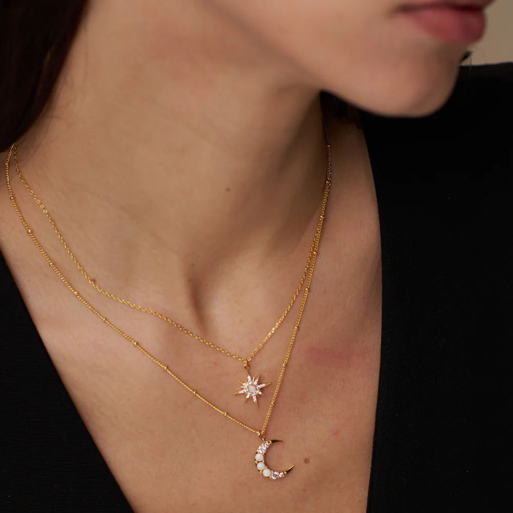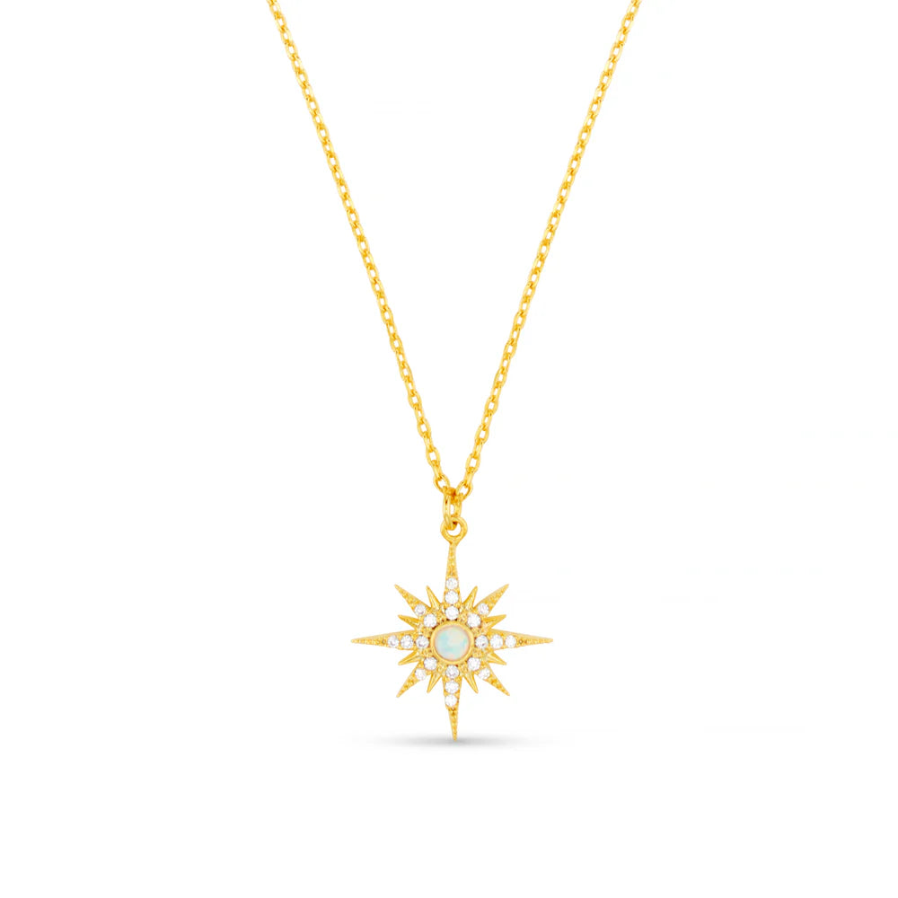 Add a touch of charm with the Opal Starburst Charm Necklace. Featuring an opal at its center, surrounded by a radiant starburst design. Whether you're a stargazer, a dreamer, or just love a little shimmer, this necklace is your perfect match.