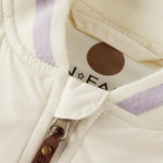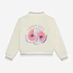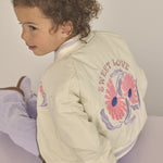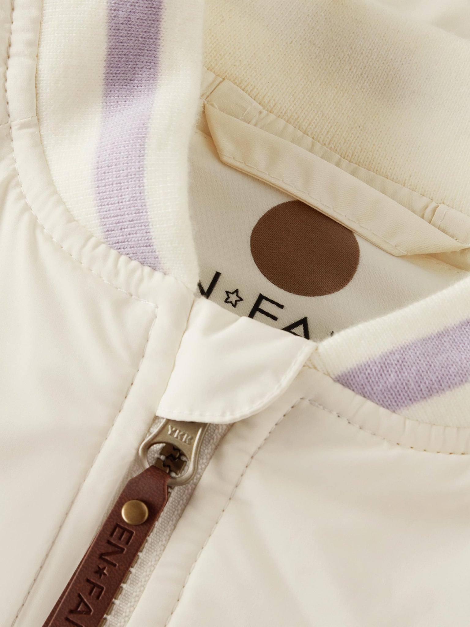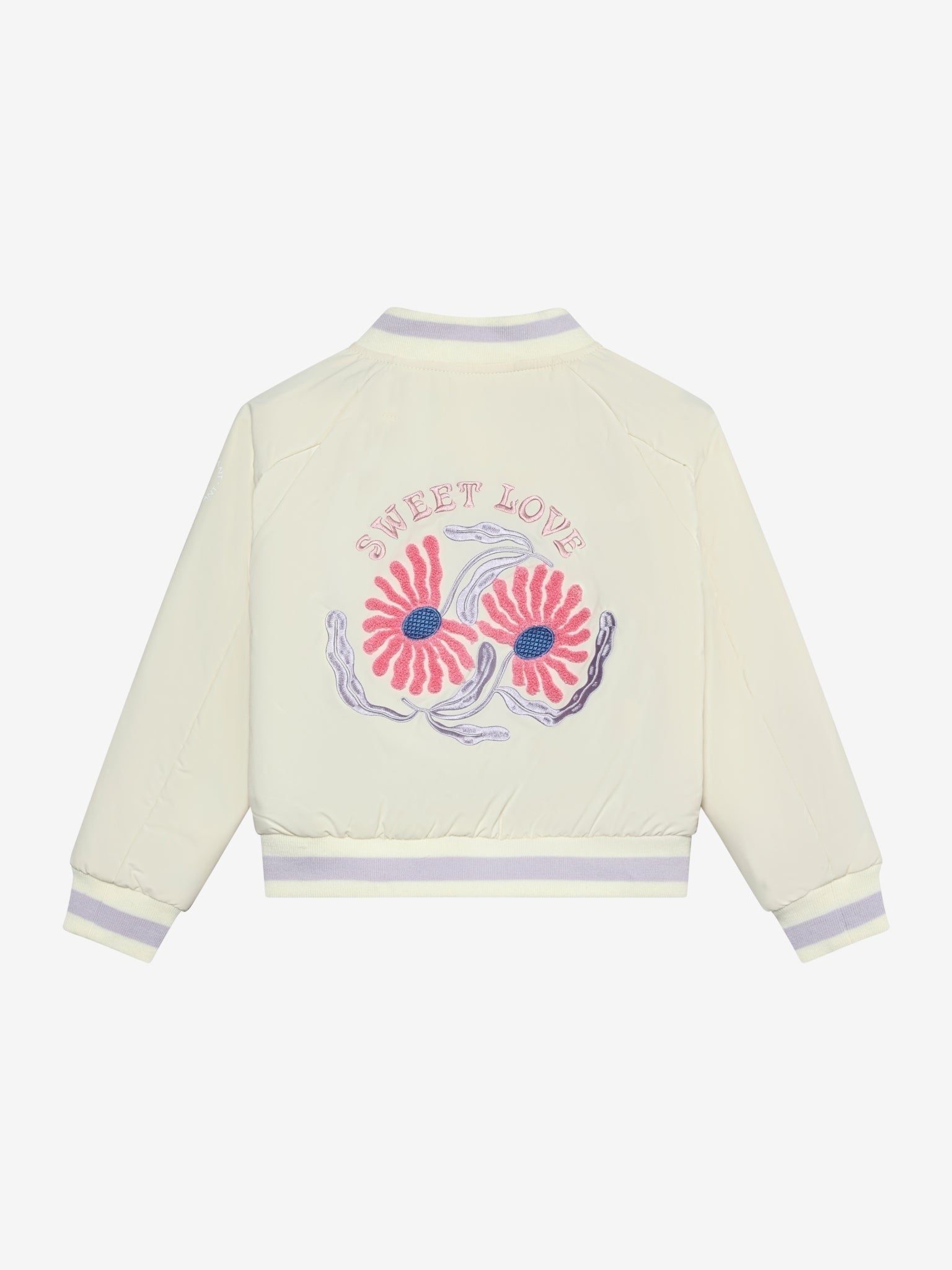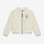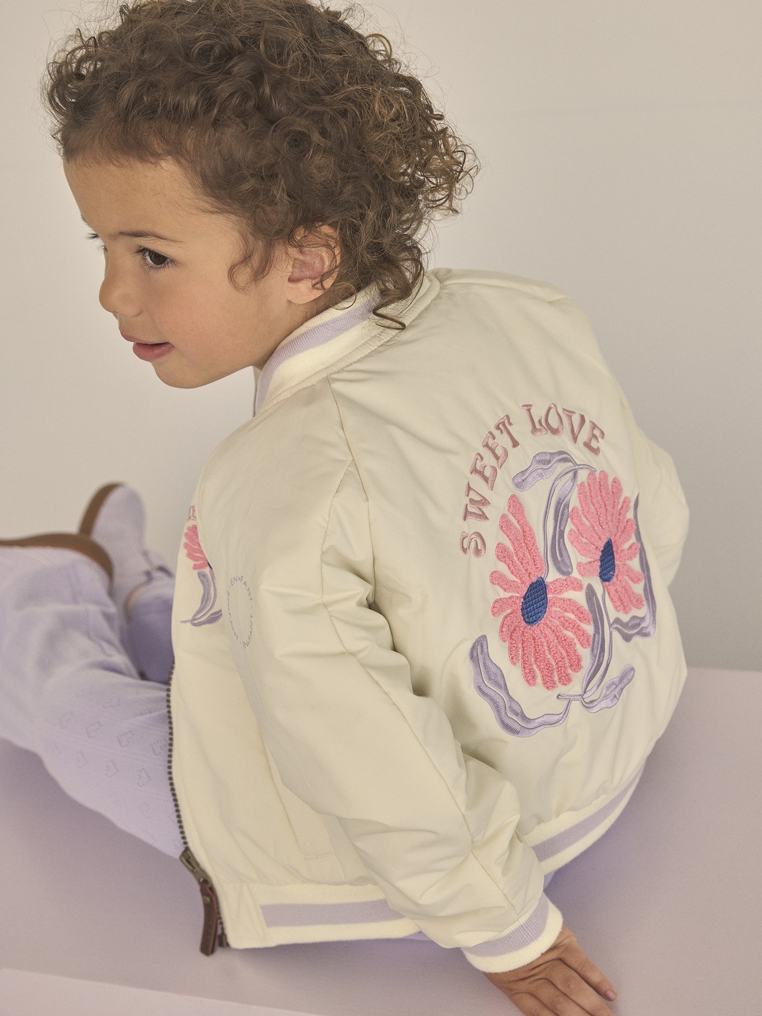 Nice bomber jacket from EN FANT. The jacket has a large embroidered motif on the back and a small motif on the front of the chest. The jacket has wide ribbed edges on the sleeves and waist. The jacket closes with a zipper with chin guard and has pockets on the sides.