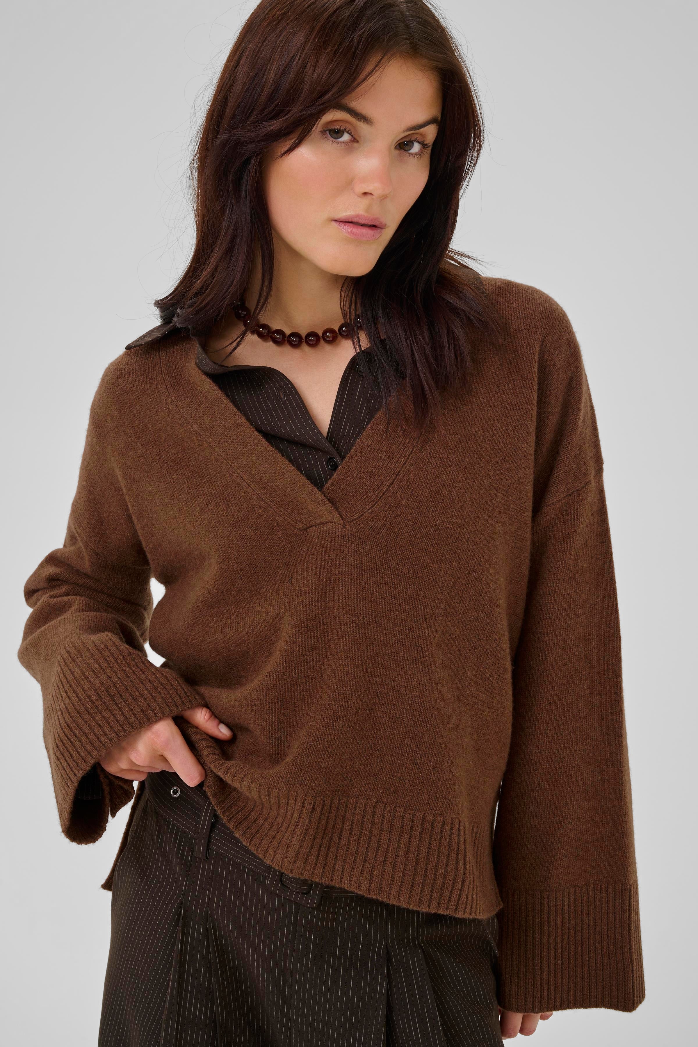 Crafted from a premium blend of 95% wool and 5% cashmere, this brown knit sweater offers both warmth and softness. Featuring a relaxed V-neckline and wide sleeves, it brings a modern, effortless silhouette to a timeless cold-weather staple. Perfect for layering or wearing on its own for a cozy, elevated look.