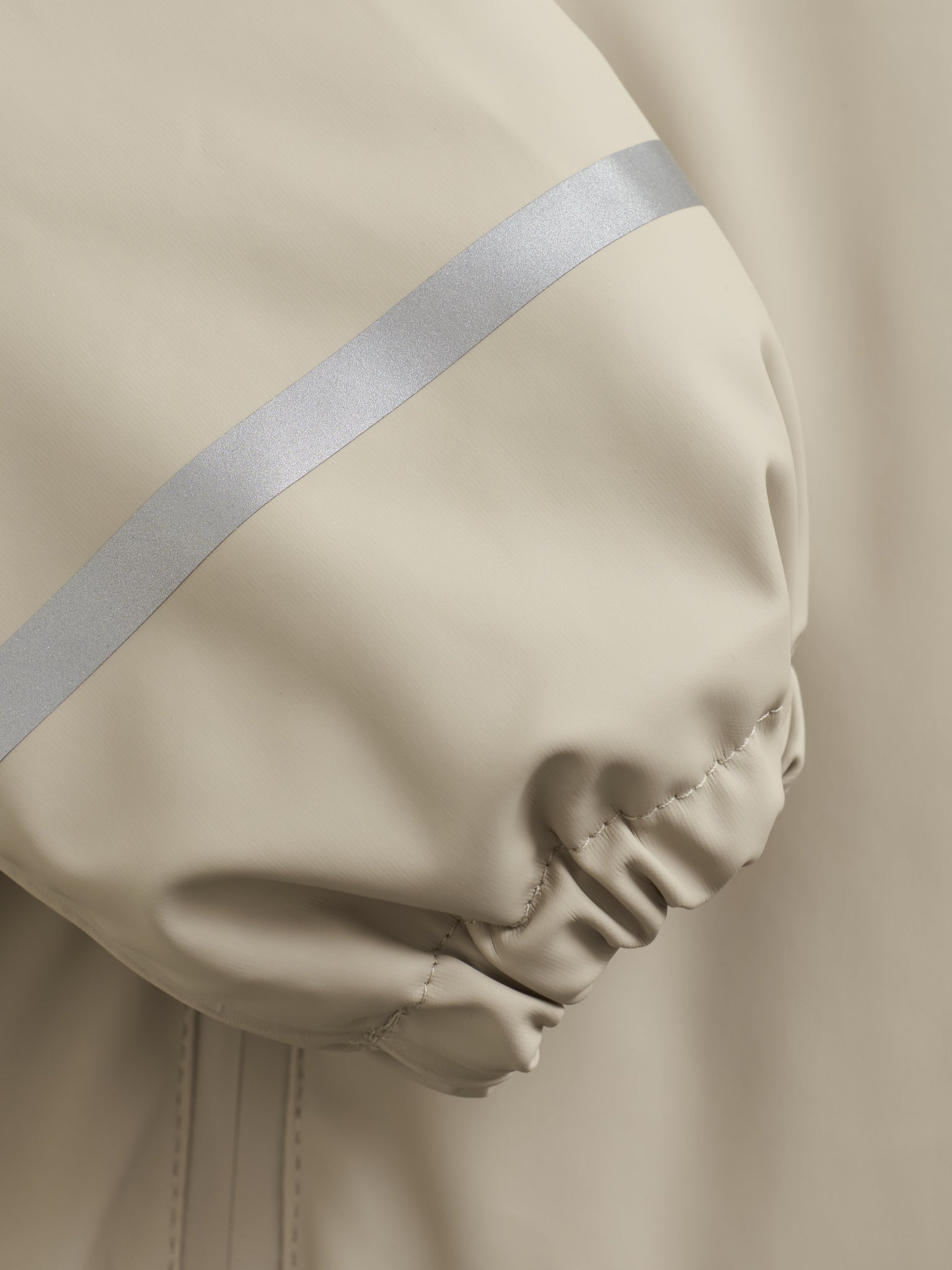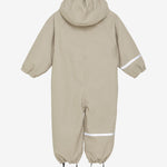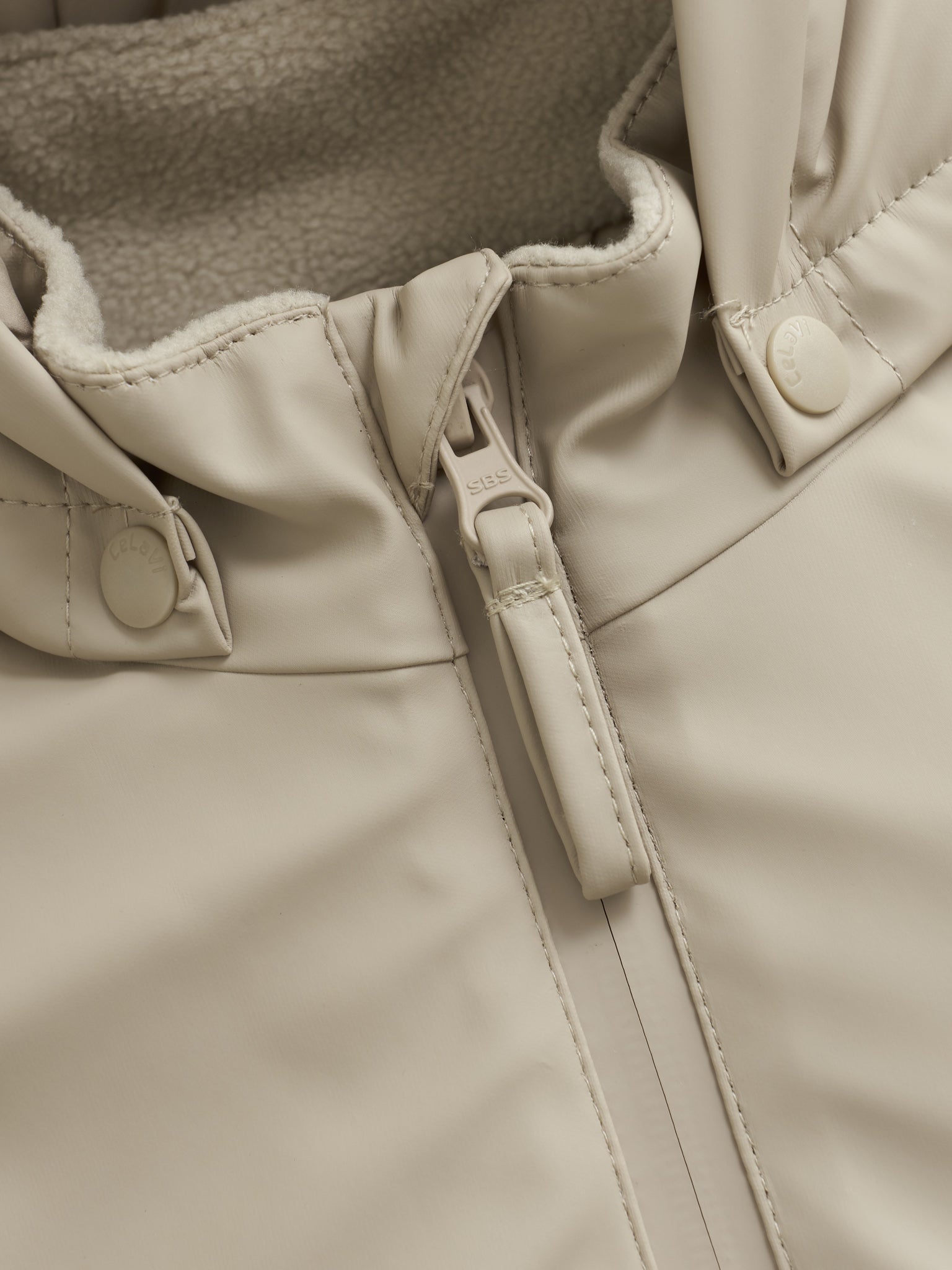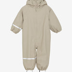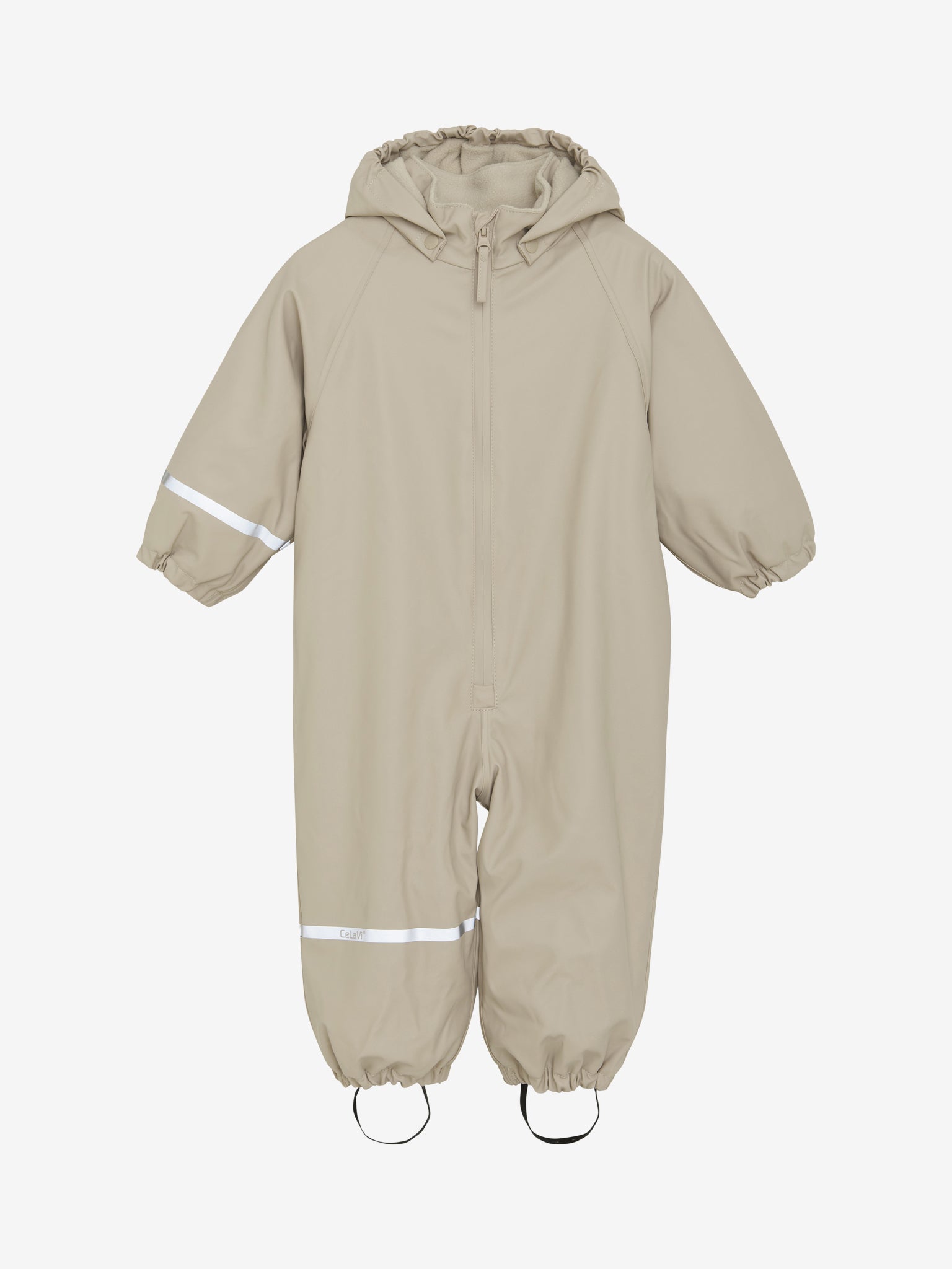 Solid colored rainsuit made of recycled polyester with PU coating with fleece lining in durable material from CeLaVi. Tested water column pressure of 10,000 mm. The suit opens at the front with a waterproff zipper with chin protector and double windpole. The chin protector makes sure that the zipper feels soft under the chin. The suit has soft fleece lining and a detachable hood. Adjustable elastic foot straps that can be put under the boots so that it stays in place. Reflective details in several places on the suit. It has a name tag inside. Certified acc. to GRS - Made with 51% Recycled Material CERES-0366