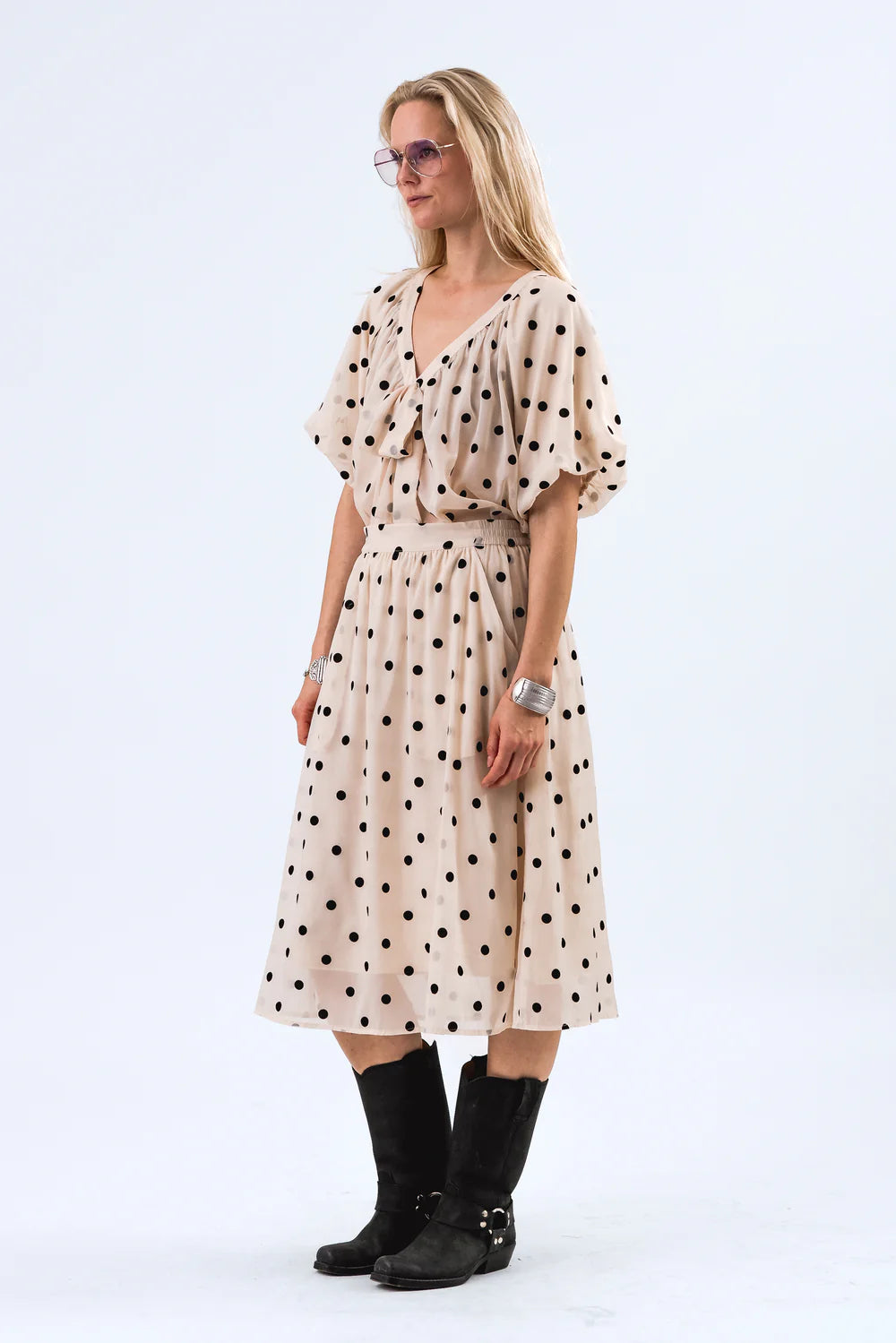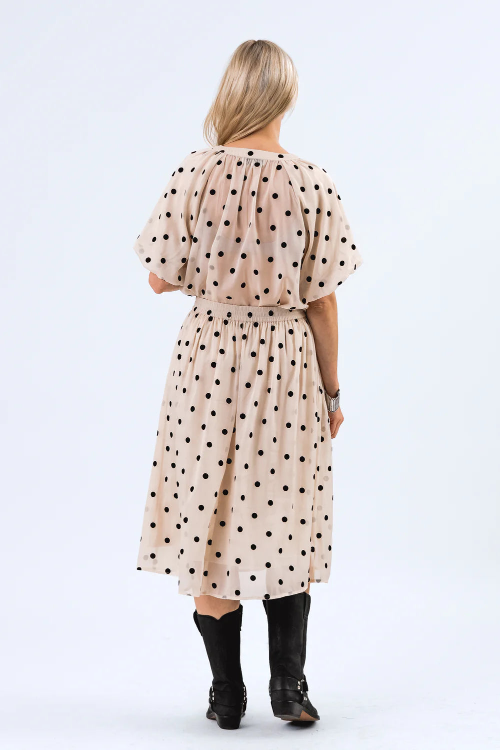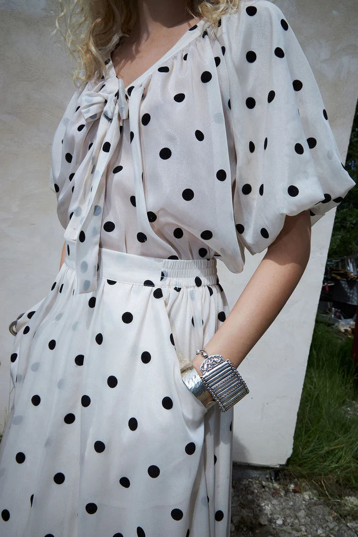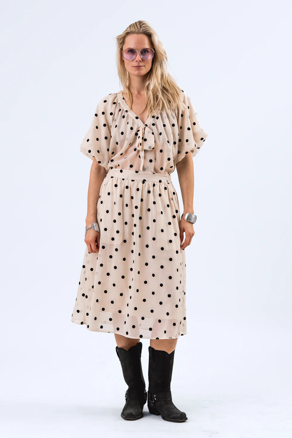 The Ella skirt is a beautiful and feminine addition to your wardrobe. With its classic polka dot pattern and lightweight design, it’s perfect for both casual and festive occasions.