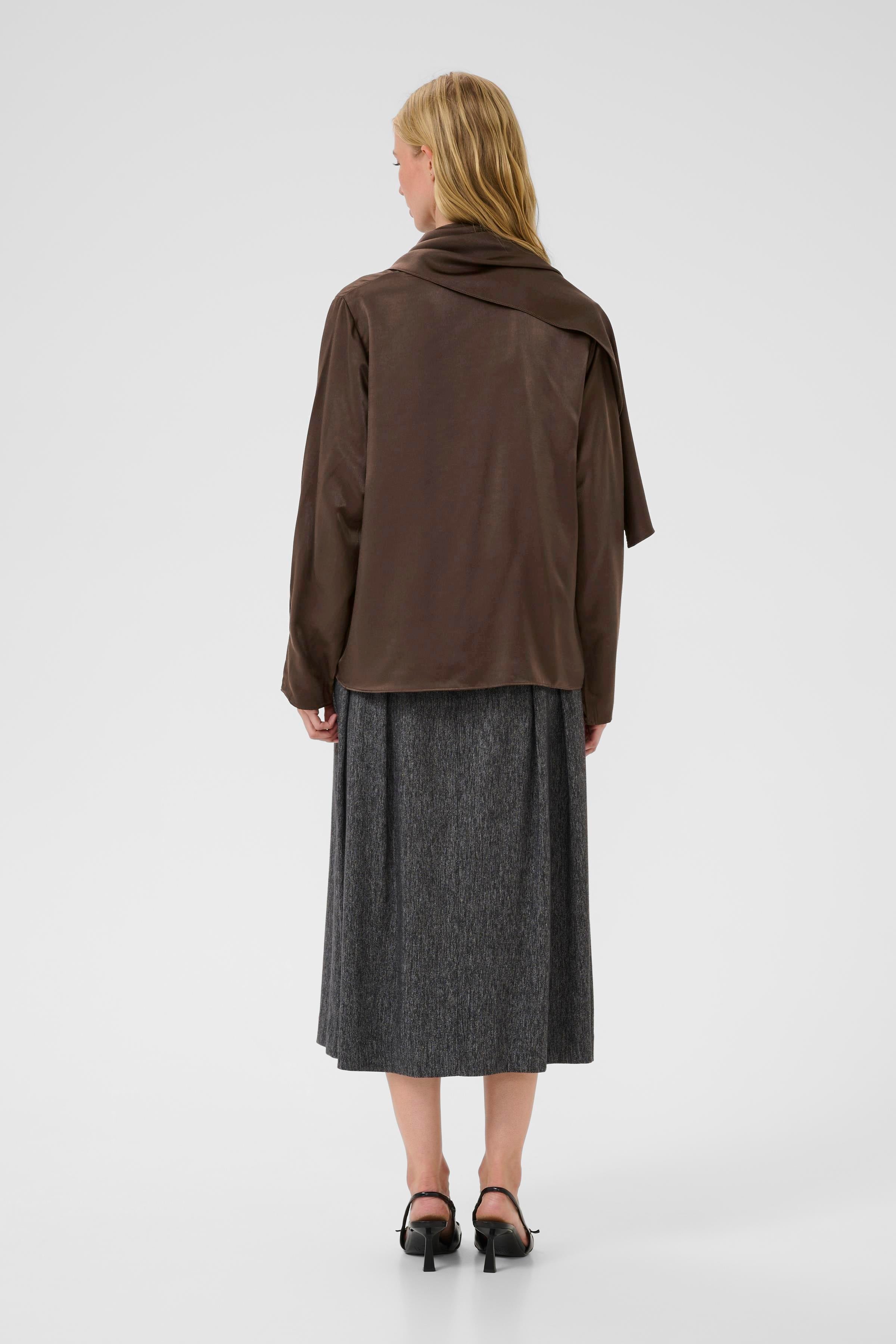 Chic and sophisticated, this brown blouse features long sleeves and a built-in scarf detail for an effortlessly polished look. Designed with a smooth, silk-like finish, it drapes beautifully for both work and evening wear. The attached scarf can be tied into a bow or left to flow for versatile styling. A timeless piece that brings elegance and ease to any wardrobe.