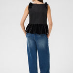 Sleeveless peplum top with V-neckline, featuring velvet bow details on shoulders and a gathered hem for a comfortable, modern fit. Perfect for both casual and semi-formal occasions, offering easy style versatility.