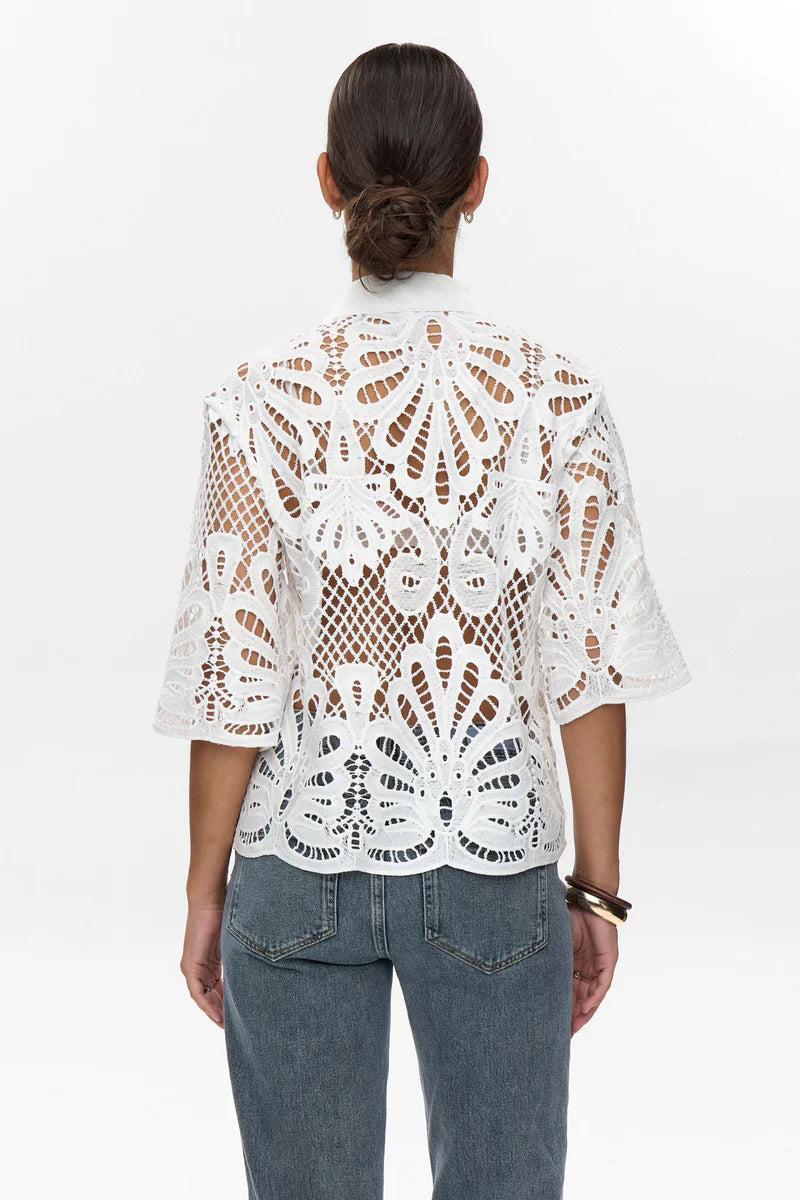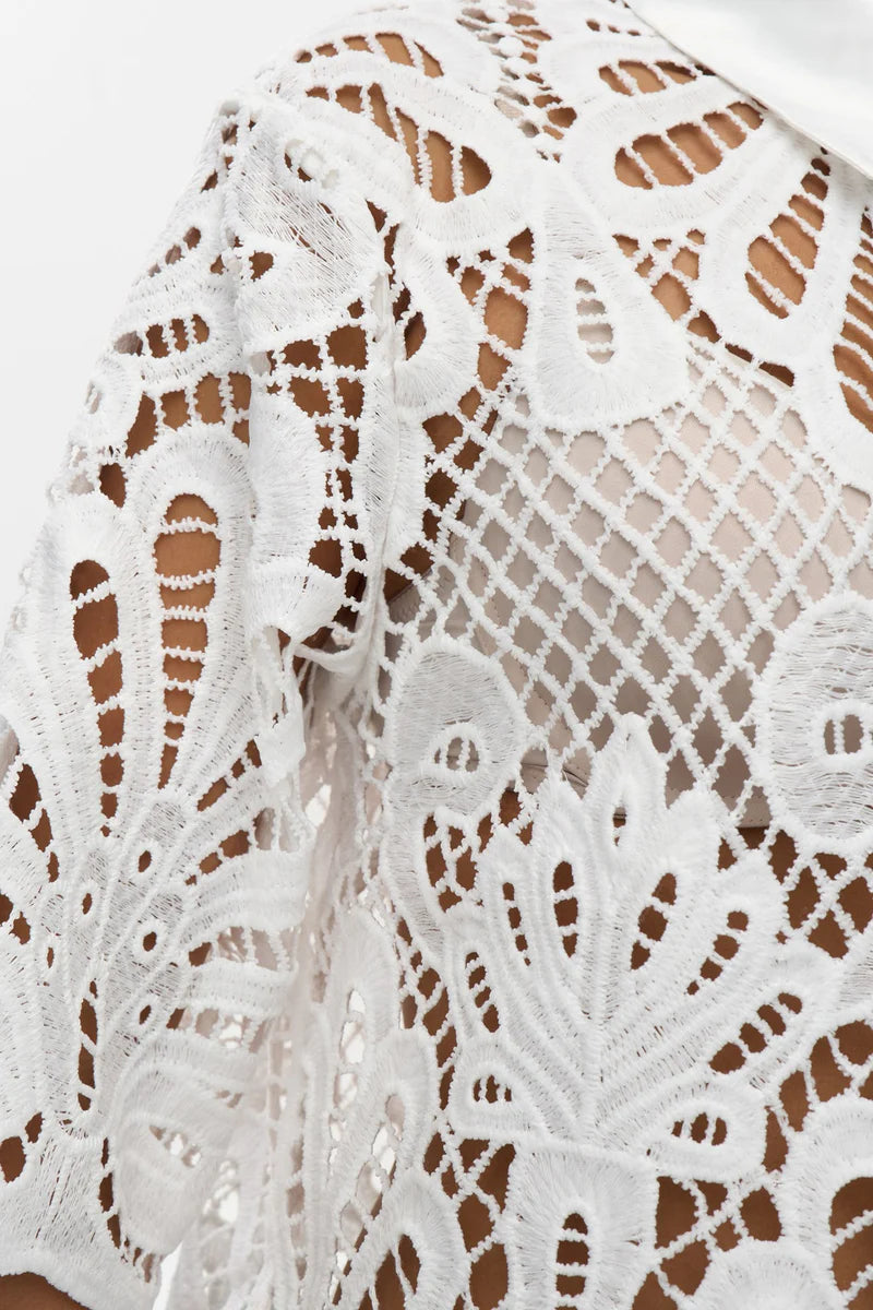 Add a touch of elegance to your wardrobe with this white crochet blouse. Featuring delicate detailing, this blouse is designed with a classic collar and button-down front for a timeless look. The airy crochet fabric is complemented by wide 2/4-length sleeves, offering a relaxed and breezy silhouette that's perfect for warm days or layered styling. Feminine, versatile and breathable- this blouse is a must-have for easy chic.