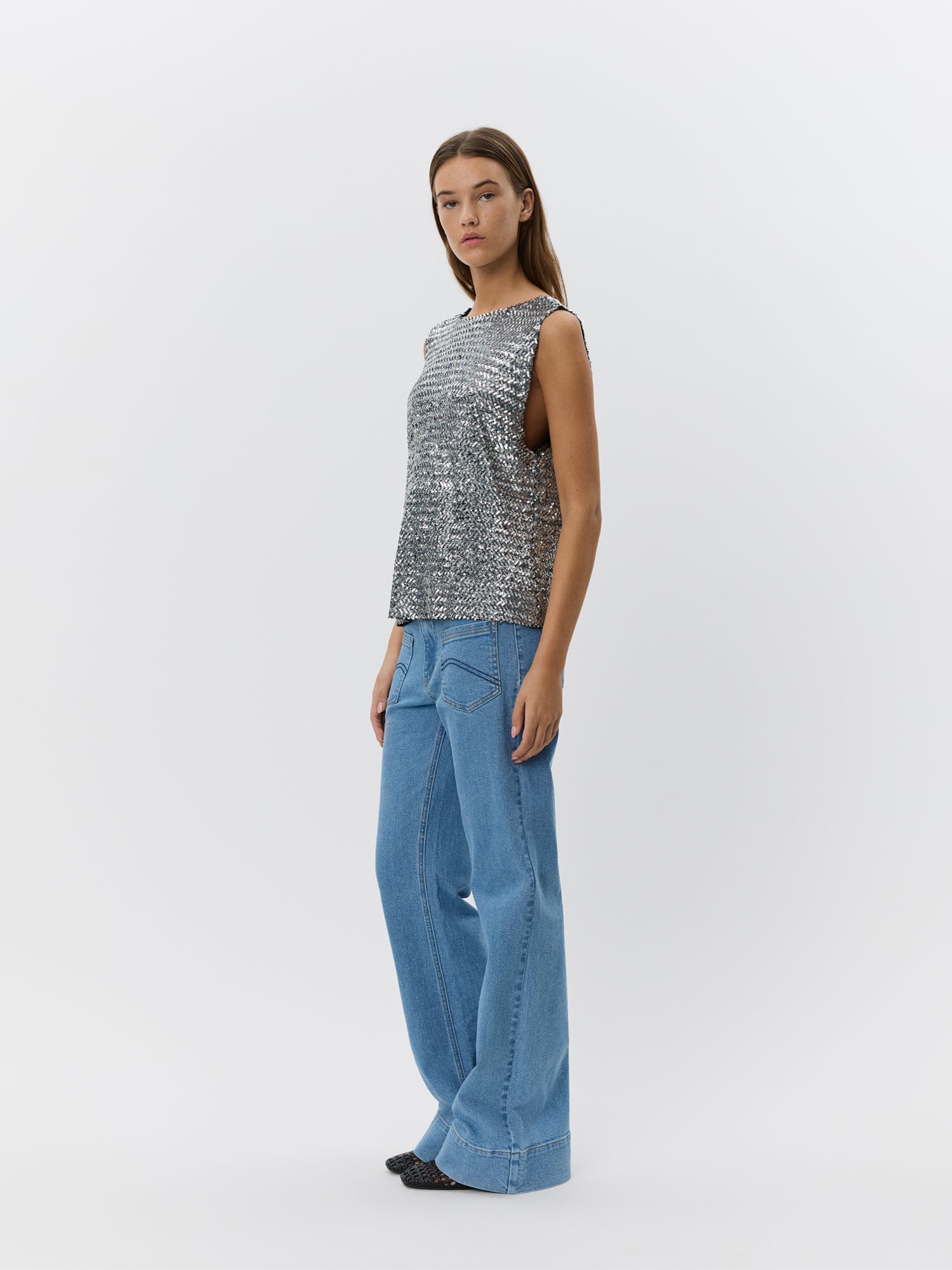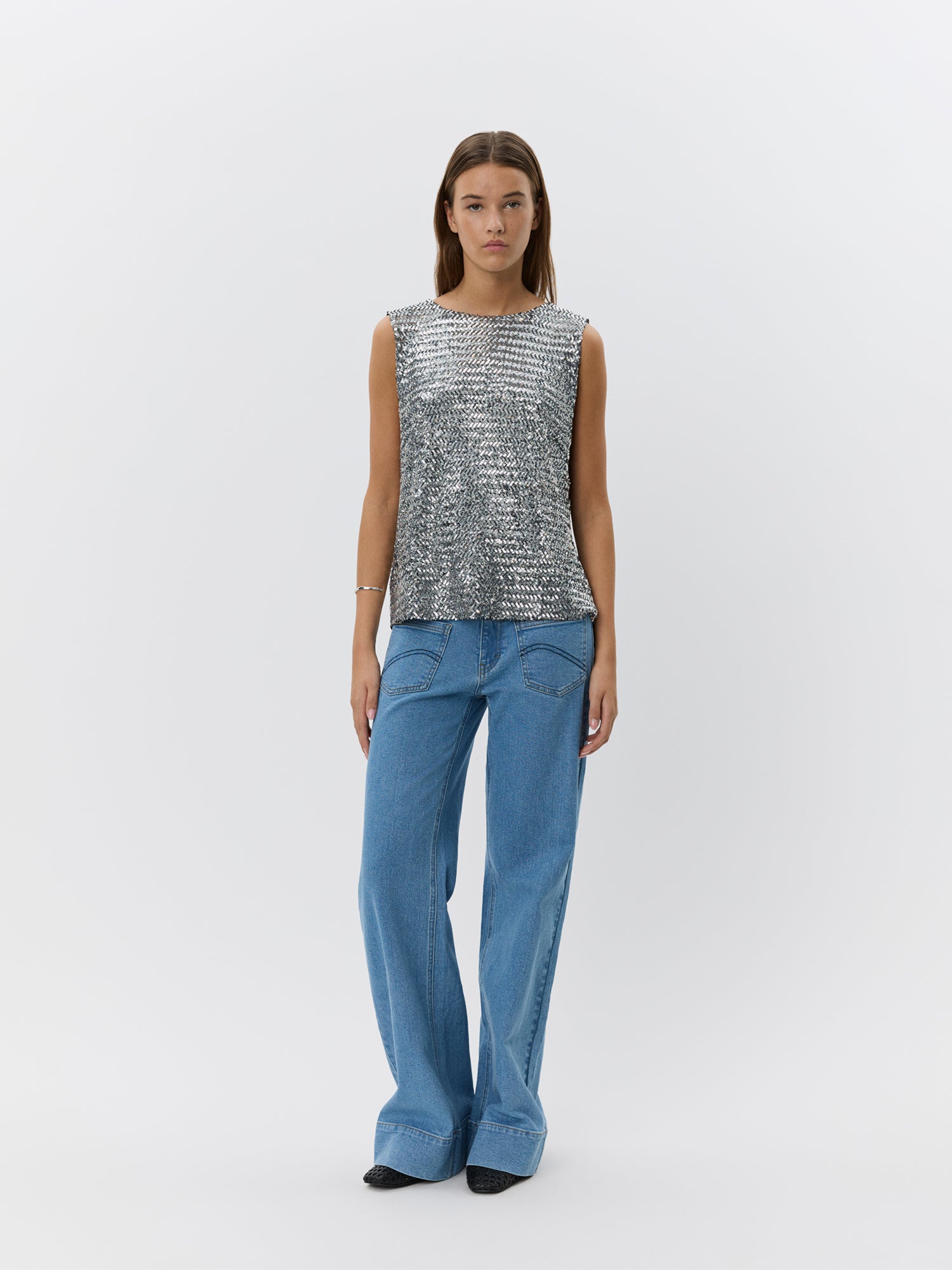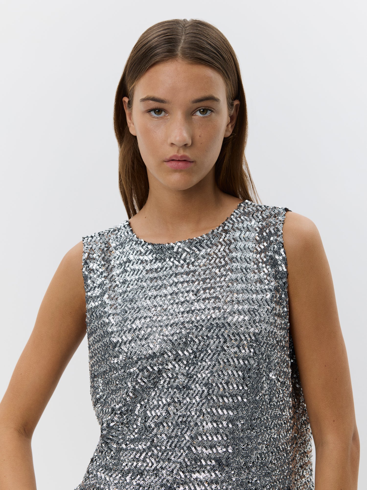 Inaya is a sleek sleeveless tank top, with a flowy style that drapes beautifully for a relaxed, comfortable fit. The short length adds a modern touch, while the silver colour gives a touch of elegance. Perfect for layering or wearing on its own this top is ideal for dressing up or down.