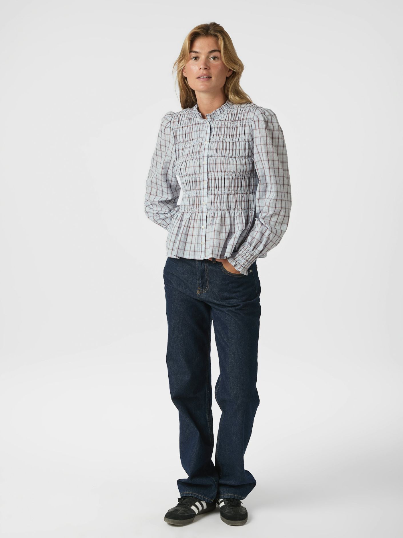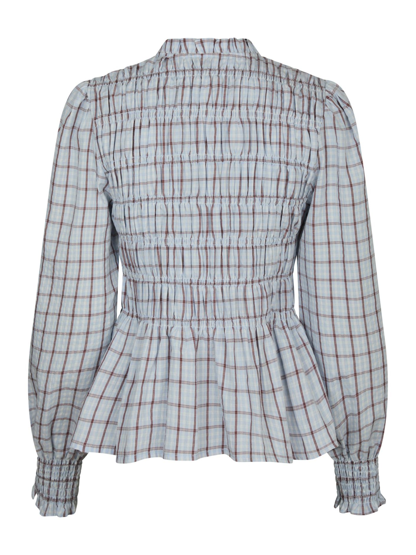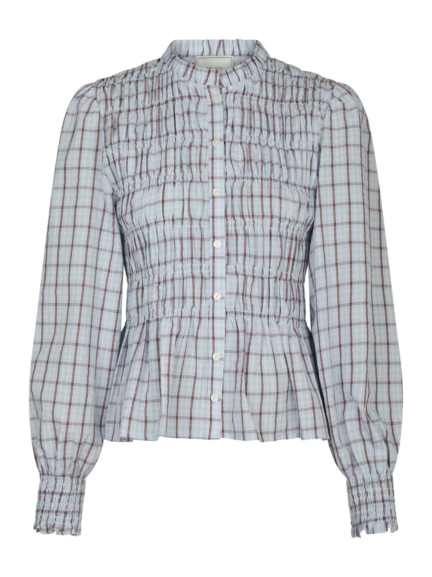 Embrace timeless femininity with this charming smock blouse, designed to elevate your everyday wardrobe. Crafted from 100% cotton, the blouse offers a lightweight and breathable feel with a beautifully textured smocked finish. Featuring a classic button closure at the front, it blends effortless elegance with subtle vintage-inspired details. The light blue base with a red tartan-inspired check pattern adds a fresh yet refined touch of colour.