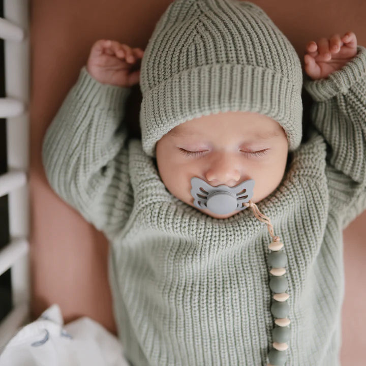 The FRIGG line of natural rubber and silicone pacifiers have been thoughtfully designed for your baby's comfort. The outward curve keeps the pacifier off their delicate skin, while features like air holes and a security handle ensure your baby stays safe. Available in a range of soft colors, FRIGG pacifiers make a beautiful addition to your collection of baby essentials.