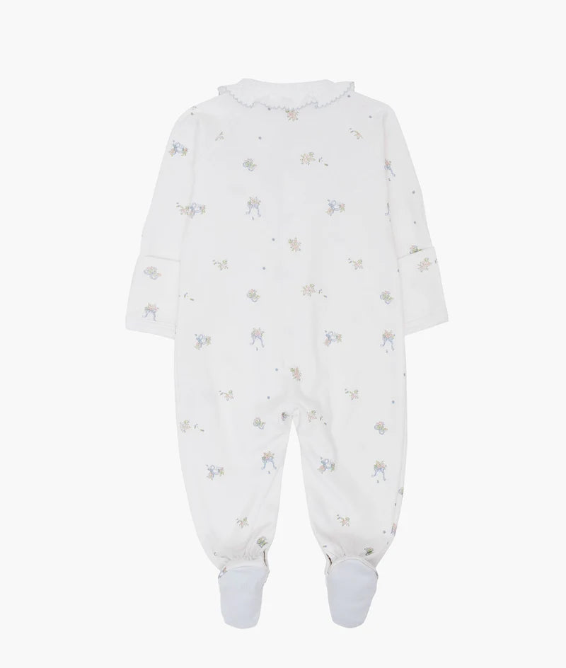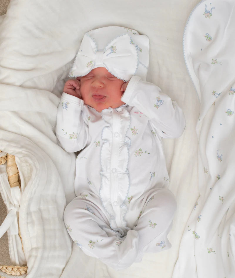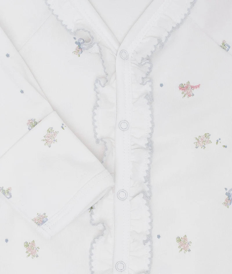 Bring your baby into the world in the softest way possible: Our ruffled footie is made from 100% hypoallergenic Pima cotton and is the perfect choice for your little one's delicate skin. Featuring our Roses And Ribbons print, nickel-free snap buttons down the front, and a ruffled details for extra cuteness.