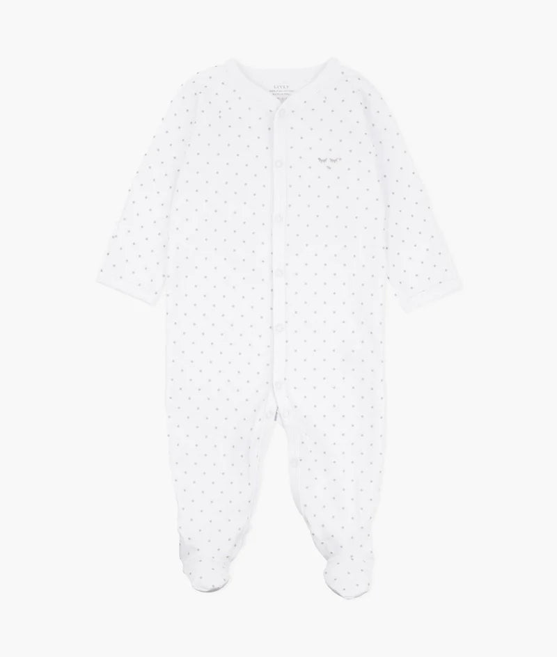 Bring your baby into the world in the softest way possible: Our simplicity footie is made from 100% hypoallergenic Pima cotton and is the perfect choice for your little one’s delicate skin. Featuring our Saturday print, nickel-free snap buttons down the front, and a soft shiny finish of the dots for extra cuteness.
