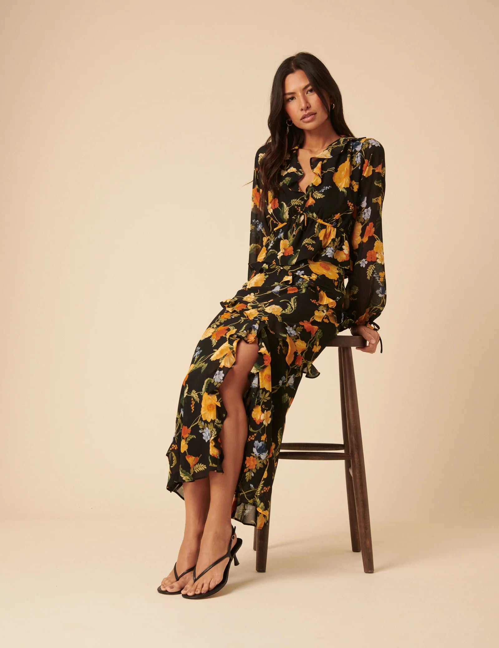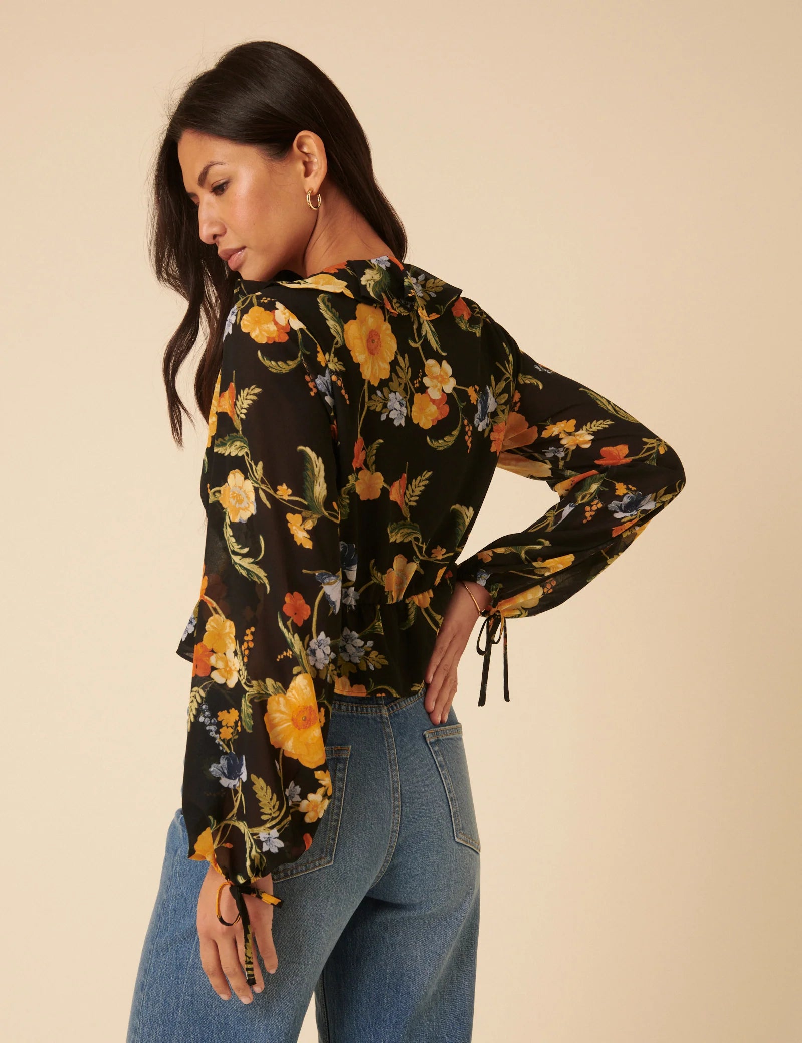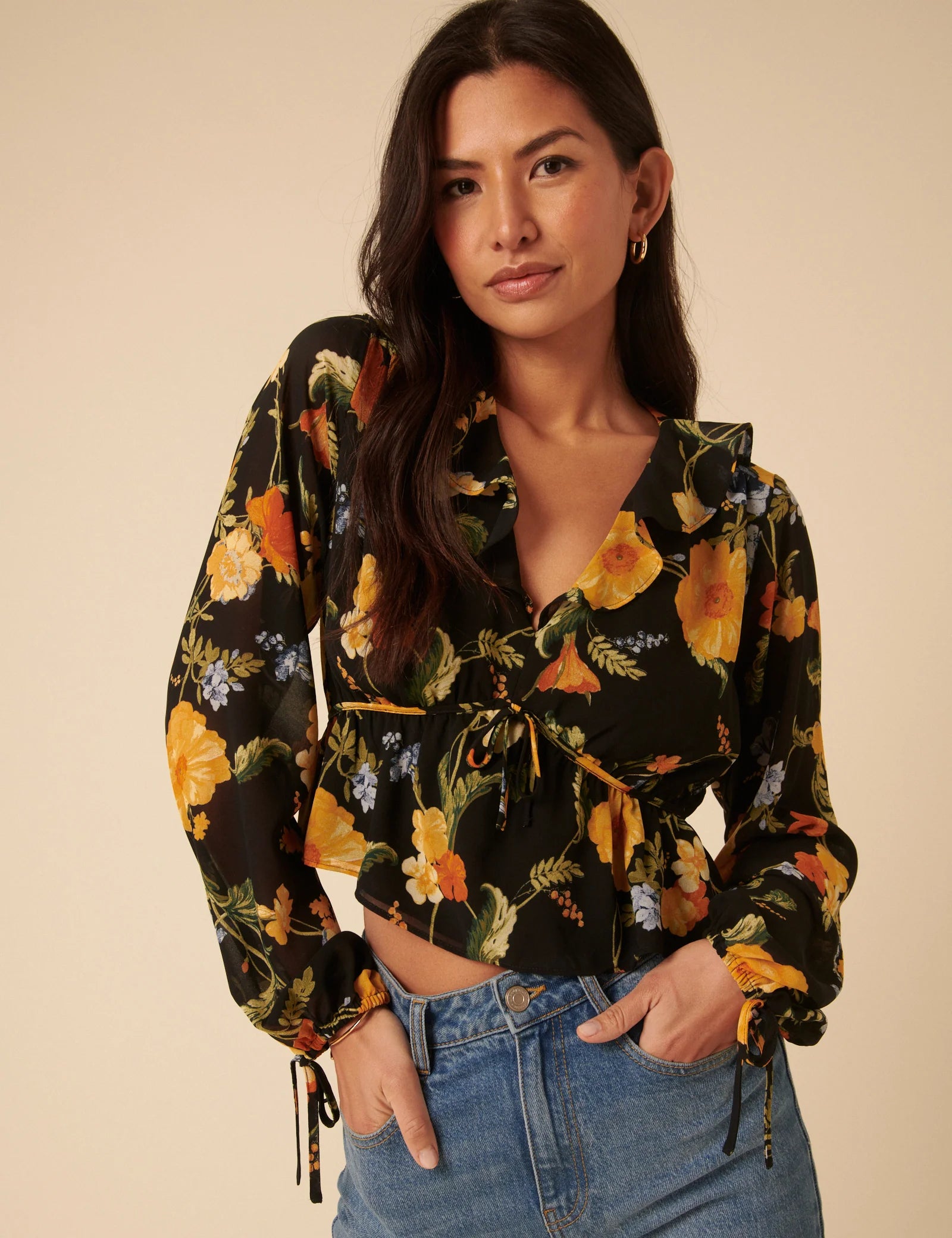This stylish black floral top features a flattering V-neckline with a delicate tie detail, adding a touch of romance to your look. Accented with yellow, blue, and green floral prints, it’s designed with long sleeves and subtle underbust seams to enhance the silhouette. The slightly cropped length makes it perfect for pairing with high-waisted skirts or jeans for an effortlessly chic ensemble.