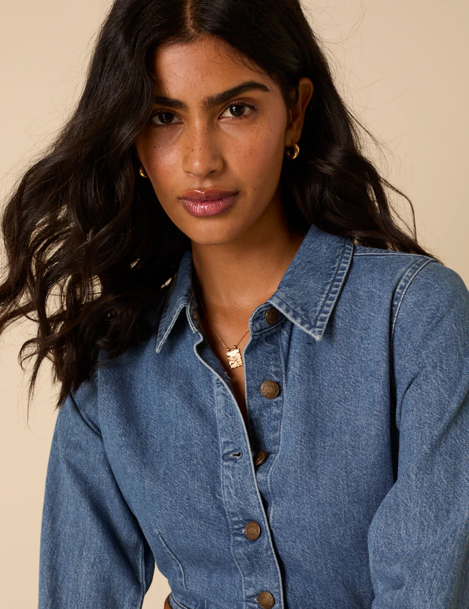 Effortlessly cool and timeless, this blue denim midi dress is a versatile wardrobe staple. Designed with a structured collar, long sleeves, and a full button-front closure, it offers classic style with a modern edge. The dress features a traditional five-pocket design and hits just above the ankles for a flattering, elongated silhouette. Perfect for layering or wearing solo across seasons.