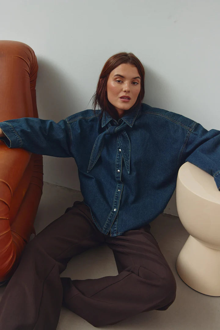 The N-Lirinnah Shirt is a fresh take on the classic denim look. It features a classic collar, long sleeves, contrasting buttons, and a matching neck scarf that adds a playful touch.