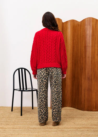 This merino wool cable-knit cardigan features a classic twisted mesh design and a vibrant red hue. With a round neckline and button-front closure, it combines cosy warmth with timeless style.