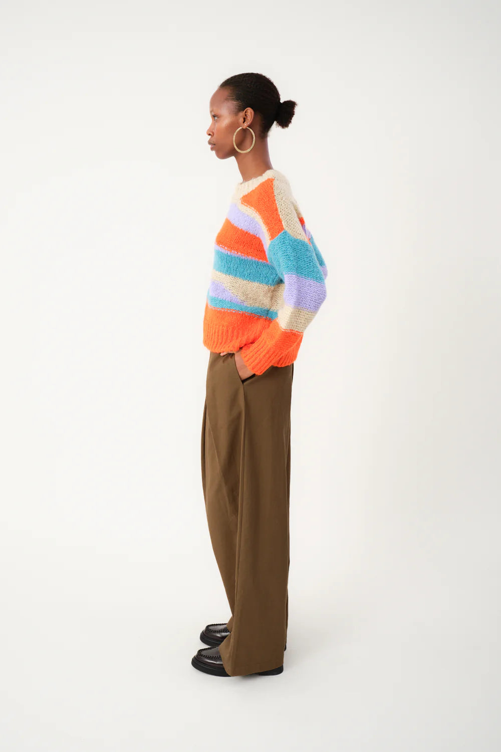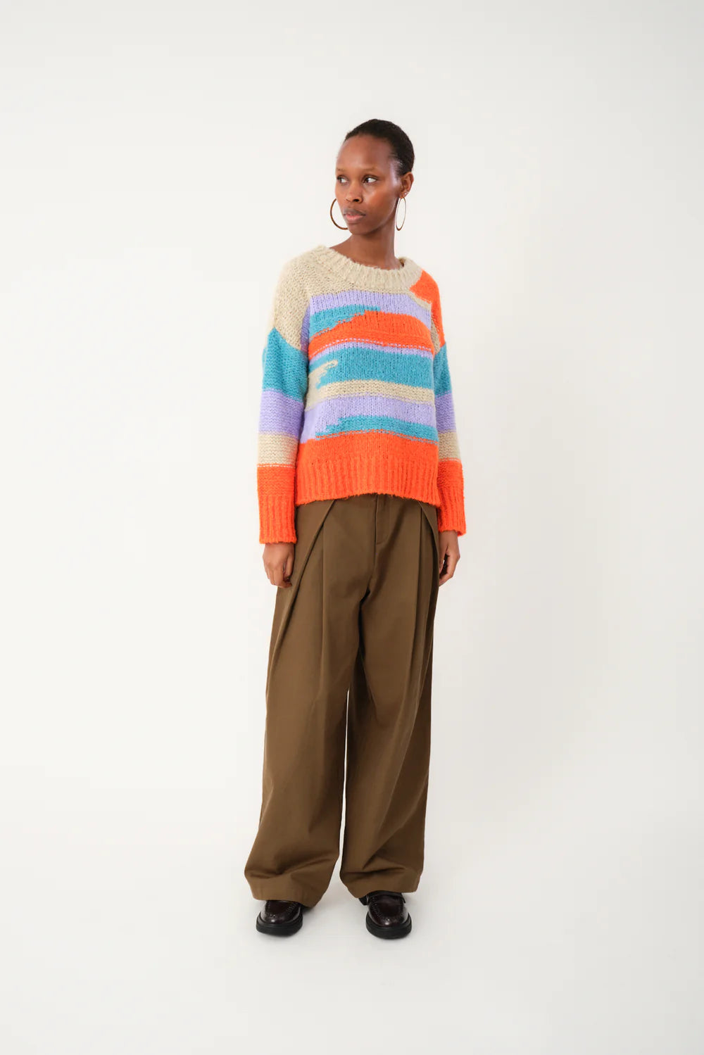 Maxima is a soft and original knit with a colorful, playful palette. It has a relaxed, loose fit with a round neckline and ribbed edges. The chunky texture makes it perfect for colder days. Style it with your favorite jeans or layer it over a dress for contrast.