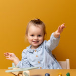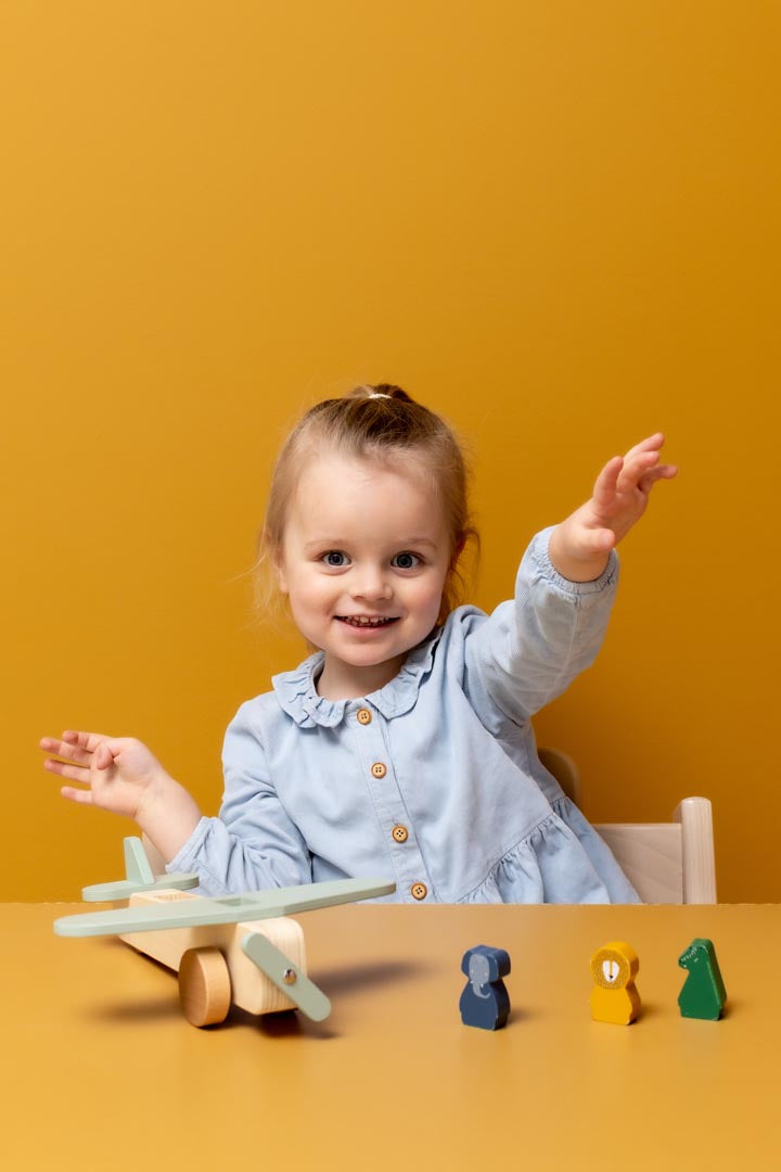 Mr Crocodile is ready for takeoff. Together with his two passengers, they travel the world. Each animal fits in each seat. One wheel in the front and a hidden wheel in the back make sure all animals will have a safe landing. Get the propeller spinning and the plane is ready for takeoff!   The airplane is made of 100% FSC® certified wood. All paints on this product are water-based, safe for children and non-toxic.