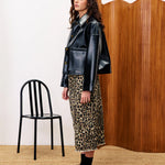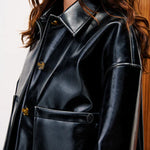 This vinyl faux leather jacket makes a bold statement with its shiny texture and durable design. Featuring two large front pockets and a button closure, it combines edgy style with practical functionality.