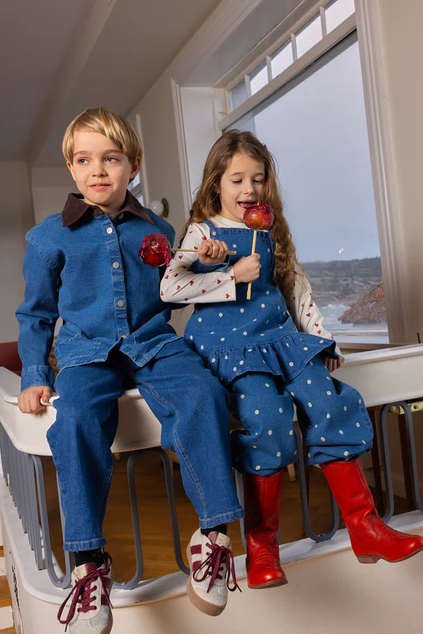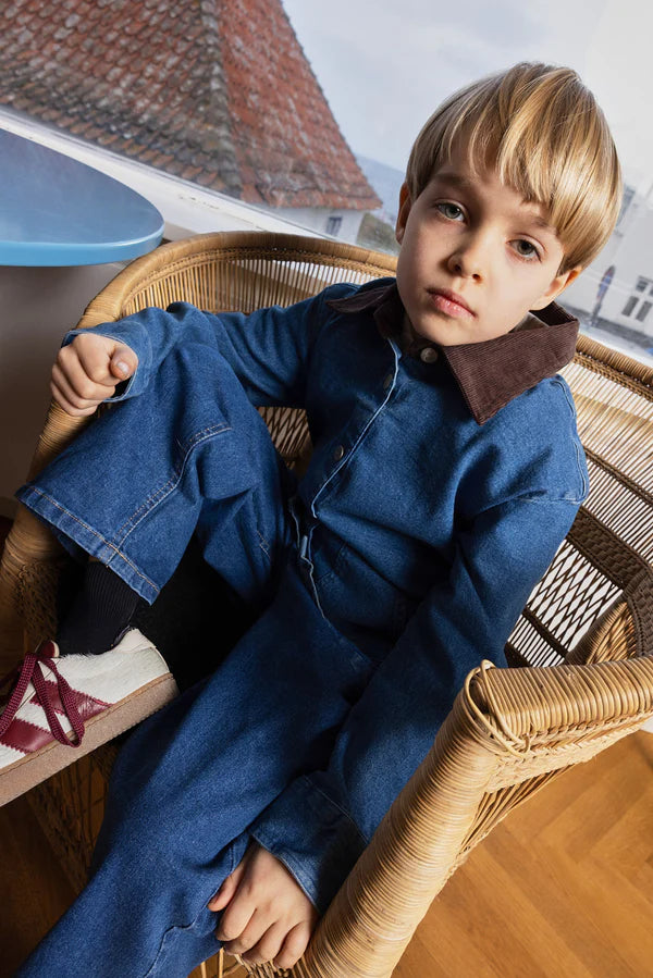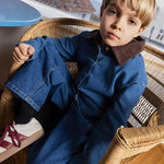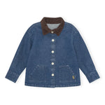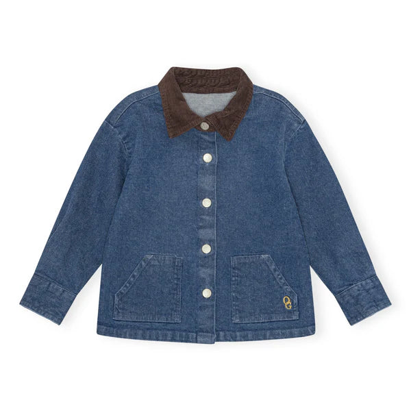 Denim shirt jacket with soft corduroy collar, pockets and snap buttons at the front.