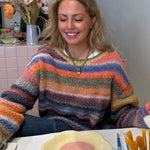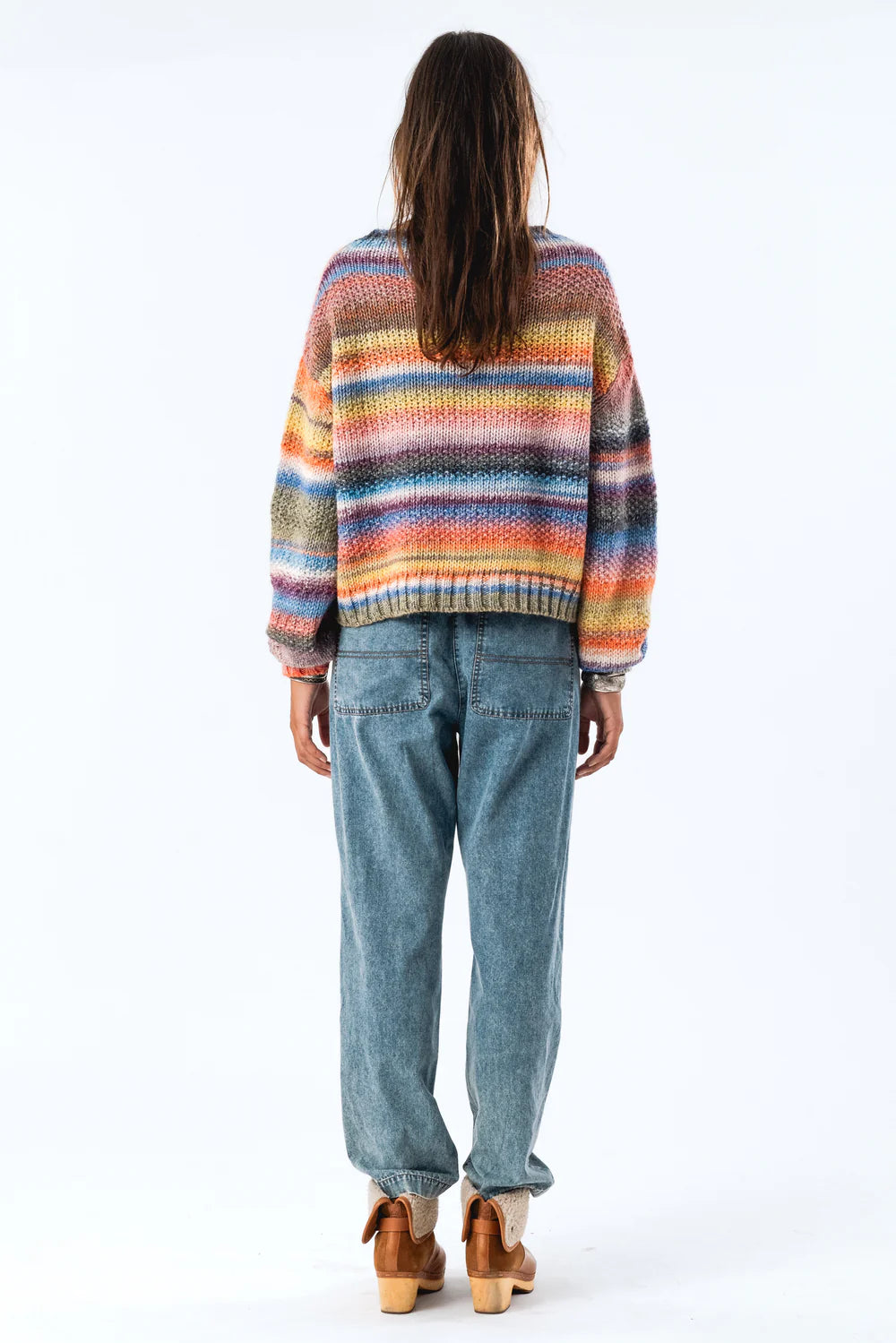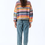 Crafted in a soft, high-quality knit, it features bold, multi-coloured stripes that bring joy and colour to your everyday wardrobe. With its slightly oversized, boxy silhouette and dropped shoulders, the fit is relaxed yet stylish — perfect for layering or wearing solo.
