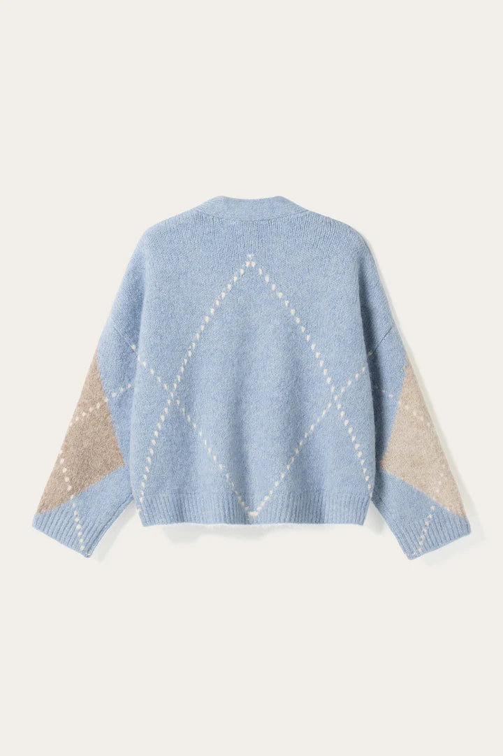 N-Laiana Knit Cardigan is an oversized cardigan with a classic Argyle-pattern. N-Laiana Knit Cardigan is designed with a relaxed fit, long voluminous sleeves, and a slightly cropped length.